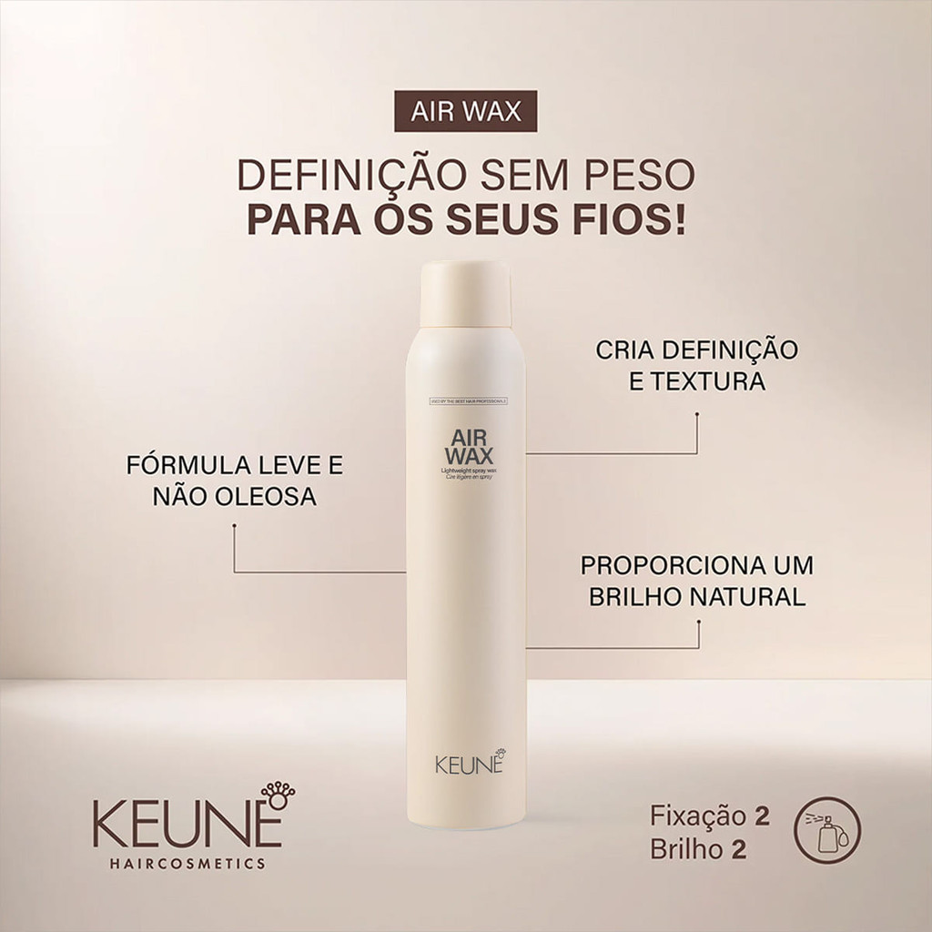 Keune Style Air Wax - Cera Modeladora em Spray 200ml Ideal para criar textura e definir o penteado. Proporciona definição, textura e brilho natural sem pesar nos fios. Com fórmula ultrafina e não oleosa, adiciona um toque de textura e definição, criando uma aparência natural e polida. Conselho de Aplicação Agite bem antes de usar. Borrife diretamente no cabelo seco a uma distância de 30 cm. Modele como preferir.