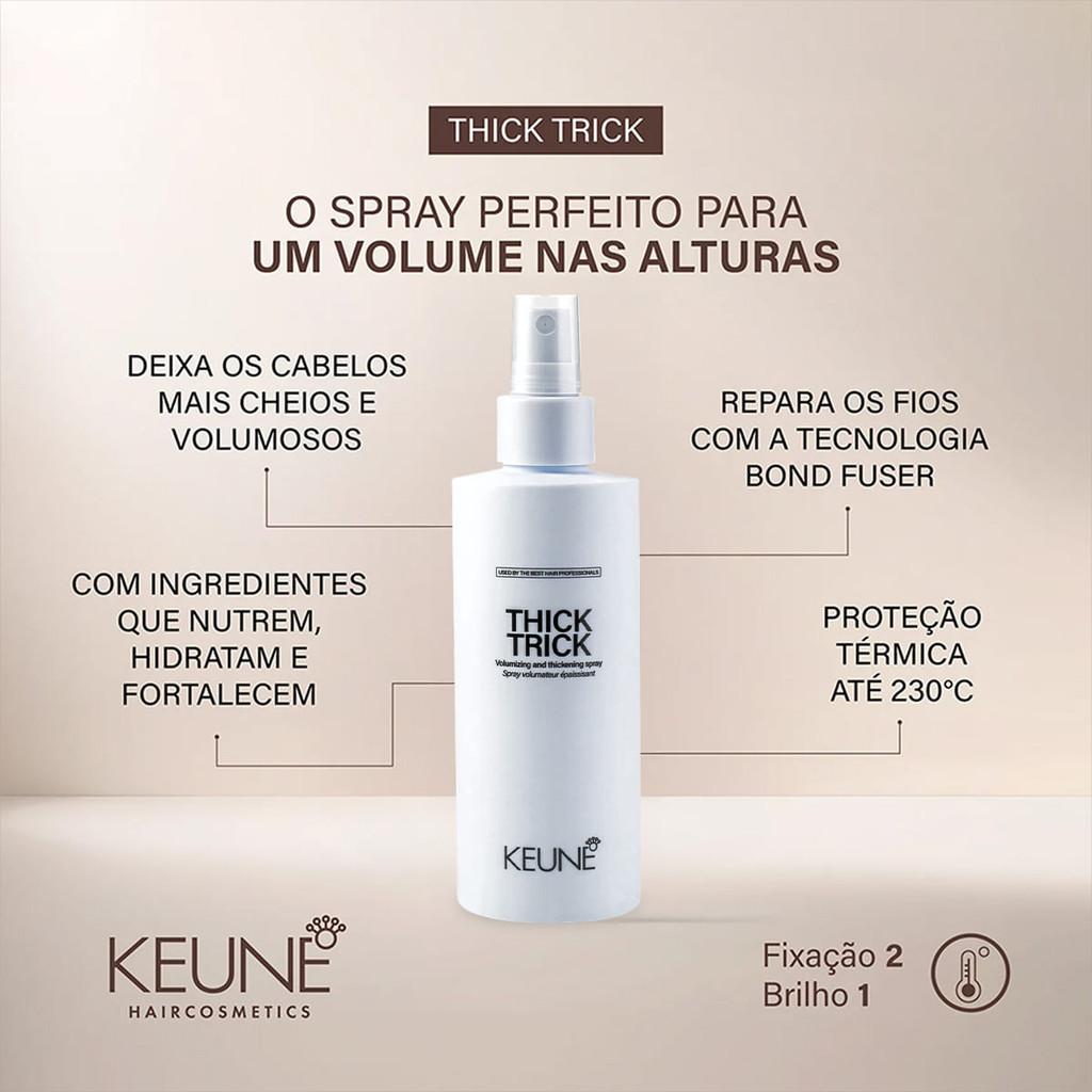 Keune Style Thick Trick - Spray Volumizador 200ml Perfeito para deixar seus fios cheios e volumosos, mantendo-os saudáveis e fortes durante a modelagem. EnriquecidO com ingredientes naturais e tecnologia avançada, proporciona uma fixação flexível, nutrição extra e fios fortalecidos. Com proteção térmica de 230°c. É uma solução prática e eficaz para transformar cabelos finos e ralos em madeixas encorpadas e com movimento. Conselho de Aplicação Aplique diretamente no cabelo seco a uma distância de 16 cm. Para dar volume à raiz, priorize a aplicação do produto nessa área. Use um secador para modelar como preferir.