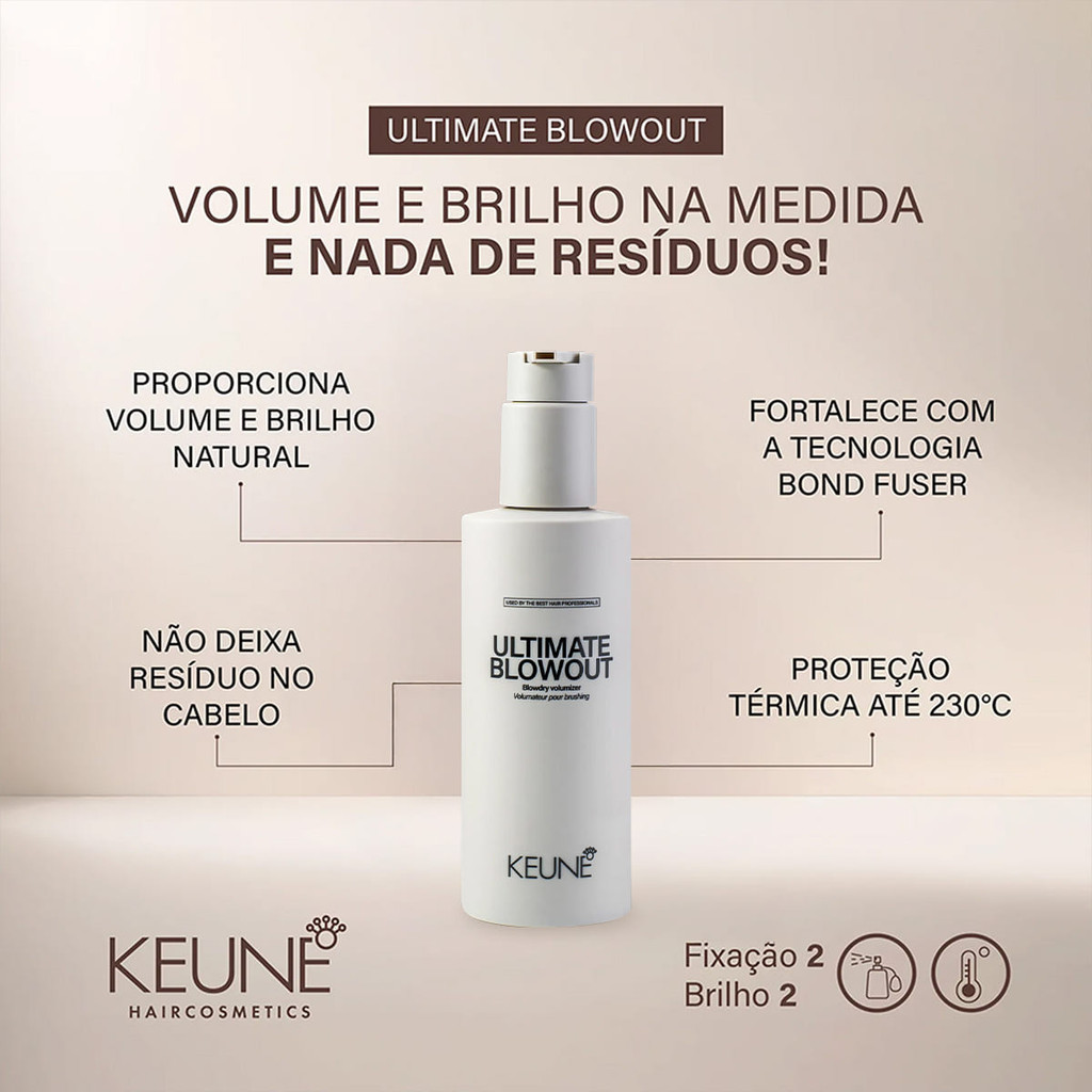 Keune Style Ultimate Blowout - Loção Térmica 200ml Ideal para dar vida, volume, movimento e brilho ao cabelo. Possui proteção térmica de 230°C, fixação média e flexível. Garante que seus fios permaneçam modelados e com aparência natural durante todo o dia. Conselho de Aplicação Com os cabelos limpos e úmidos, aplique uma quantidade adequada do produto, espalhando uniformemente da raiz às pontas. Seque os cabelos com o secador, modelando conforme preferir. Para finalizar e fixar o look, utilize o ar frio do secador.