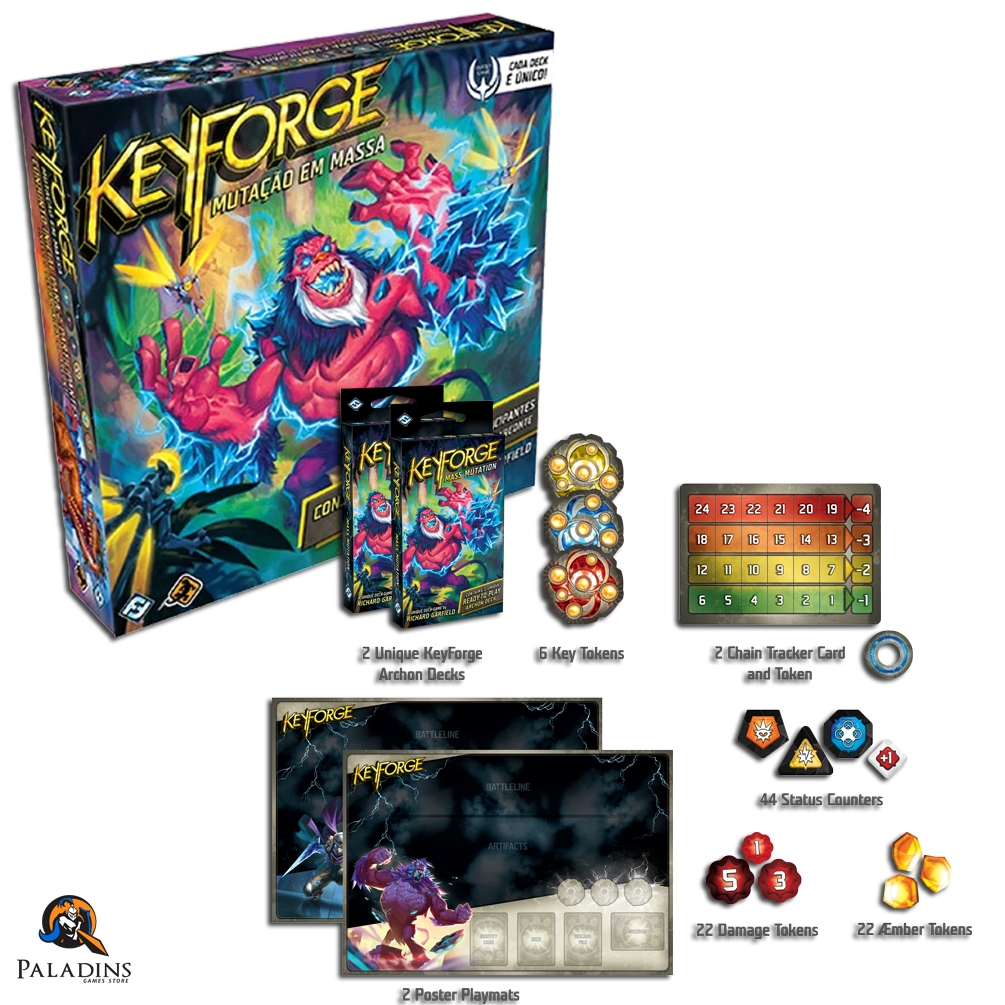 Produto lacrado, 100% original em português!! Fabricante: Galápagos Do mesmo criador do fenômeno Magic The Gathering, KeyForge é uma aventura de cards para dois participantes onde cada um assume o papel de um Arconte e comanda seu deck contra o oponente. O deck de um participante representa uma facções aliadas que está tentando obter Æmber para forjar chaves. O primeiro que forjar três chaves vence o duelo.A característica mais marcante de KeyForge é que não existem dois decks iguais. Em vez disso, cada um já é aleatoriamente gerado, customizado e pronto para usar. Cada deck existente é único!A quarta coleção da saga KeyForge, Mutação em Massa introduz 250 cards inéditos em meio às constantes mutações causadas pelo Æmber sombrio! Descubra criaturas gigantes e vivencie o triunfante retorno da casa Santuário para o Caldeirão!Idade 14 + 30 min 2 jogadores**Componentes**2 decks de Arconte exclusivos6 fichas de chave22 fichas de æmbar22 fichas de dano44 fichas de condição2 indicadores de correntes2 fichas Indicadoras de correntes1 guia de início rápido2 playmats em formato pôster**Não acompanha Sleeves**37 (63.5 mm X 88.0 mm) A característica mais marcante de KeyForge é que não existem dois decks iguais. Em vez disso, cada um já é aleatoriamente gerado, customizado e pronto para usar. Cada deck existente é único!