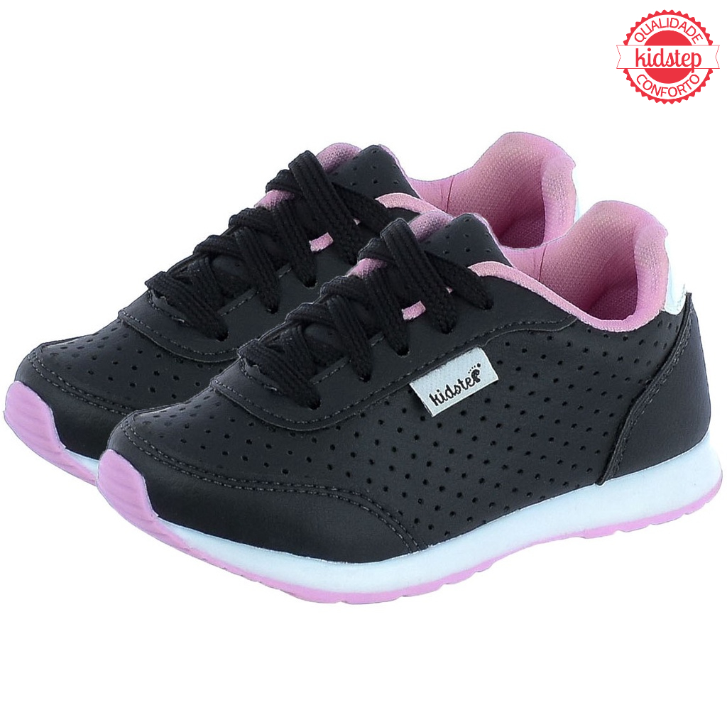 Kidstep Tenis Infantil Feminino Menina Escolar Jogging Preto com Rosa Barato 20 ao 36