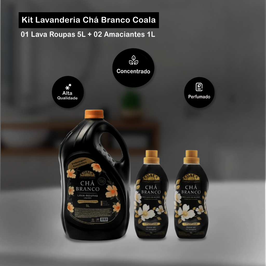 Kit 01 Lava Roupas 5L + 02 Amaciantes 1L Chá Branco Coala Lava Roupas Líquido Chá Branco 5L Coala O cuidado com as roupas começa com uma limpeza eficaz e um toque de sofisticação. Desenvolvido para quem valoriza alto desempenho aliado a uma fragrância refinada. Indicação de Uso: - Lavagem de roupas brancas e coloridas. Modo de Uso: - Use 50ml de produto para cada 8kg de roupa; - Lave separadamente roupas brancas e coloridas. Para manchas, aplique diretamente no local, deixe agir por alguns minutos e lave normalmente. Rendimento: Até 100 lavagens Amaciante Concentrado Chá Branco 1L Coala O Amaciante de Roupas Concentrado Coala é um produto premium desenvolvido para proporcionar maciez extrema e um perfume sofisticado às suas roupas. Sua fórmula concentrada rende até 50 lavagens, oferecendo um excelente custo-benefício. Além disso, é biodegradável e não irritante, alinhando-se a práticas sustentáveis. Indicação de Uso: - Lavagem de roupas brancas e coloridas. Modo de Uso: - Use ½ tampa por lavagem. Aplique no compartimento da máquina ou dilua na água do último enxágue; - No tanque, deixe agir por 5 minutos; Fragrância: Chá branco Embalagem: 01 Lava Roupas Chá Branco Coala 3L + 02 Amaciantes Concentrados Chá Branco Coala 1L cada
