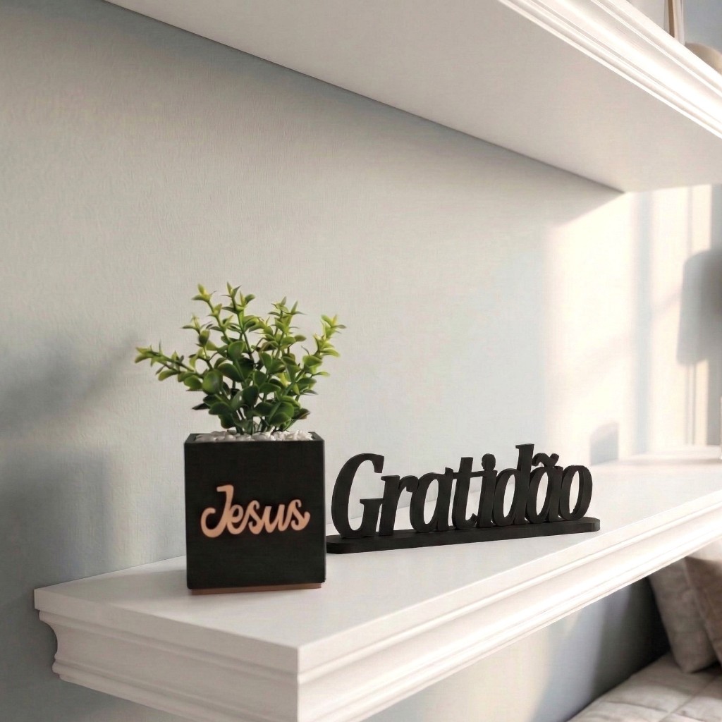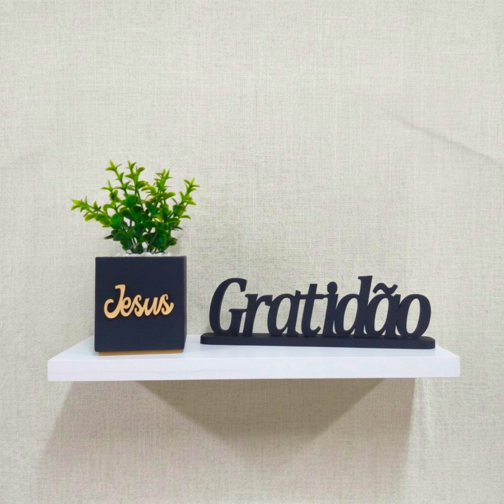 Vaso Decorativo com Plantinhas Artificiais e Letreiro “Gratidão” Transforme qualquer ambiente com este lindo conjunto decorativo! Descrição do Produto: Vaso: Feito de MDF na cor preta, com a palavra “JESUS ” fixada no vaso. Plantinhas Artificiais: Acompanham o vaso, trazendo um toque de verde sem a necessidade de manutenção. Detalhe: Pedrinhas decorativas fixas no vaso, garantindo que não se espalhem. Letreiro Decorativo: Com a Palavra “Jesus ”, também em MDF preto, com aproximadamente 18cm de Largura . Dimensões do Vaso: Altura com a planta de 12 a 13 cm e largura de 7 a 8 cm. Assim que o pagamento for aprovado ..Despachamos seu pedido o mais breve possível .. Siga nosso loja na Shopee sempre postamos novidade.Com descontos legais ..