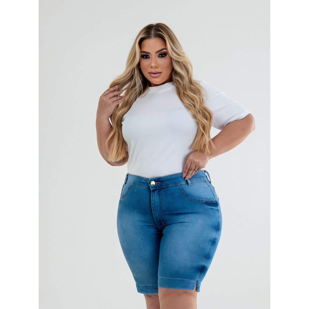 Kit 02 Bermudas Jeans Plus Size Para O Carnaval Cintura Alta Até o Joelho Elastano Modelagem Levanta Bumbum