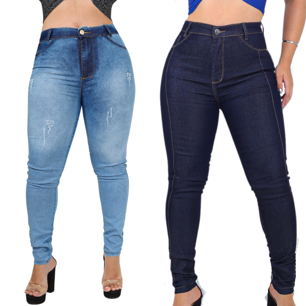 Kit 02 Calças Cós Alto Jeans Feminino Com Elastano Até o Umbigo Skinny Veste bem