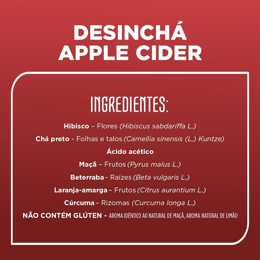 - 02 Desinchá Apple Cider (30 sachês - cada caixinha). O que é Desinchá Apple Cider? Desinchá Apple Cider, é o mais novo chá da Desinchá a base de hibisco e maçã, vem com 30 sachês na caixinha. Com a missão de mostrar que saúde é simples, a Desinchá alia pesquisa constante e alta tecnologia para ajudar na melhor qualidade de vida de todos. Seus produtos prezam pelo bem-estar sem esquecer da leveza e de sabores irresistíveis. Benefícios Desinchá Apple Cider ✓ Zero Calorias ✓ Sem Conservantes ✓ Sem Corantes ✓ Zero Açúcar INGREDIENTES • Hibisco • Chá Preto • Maçã • Beterraba • Laranja Amarga • Cúrcuma • MODO DE PREPARO Esquente 200 ml de água. Antes de começar a ferver, já pode desligar. Depois basta me colocar dentro da água quente, tampar e esperar por 5 minutinhos. E pronto! Prefere me tomar gelado? É só fazer tudo igualzinho e, no final, adicionar gelo. Fico bom por aproximadamente 24 horas, guardando na geladeira.