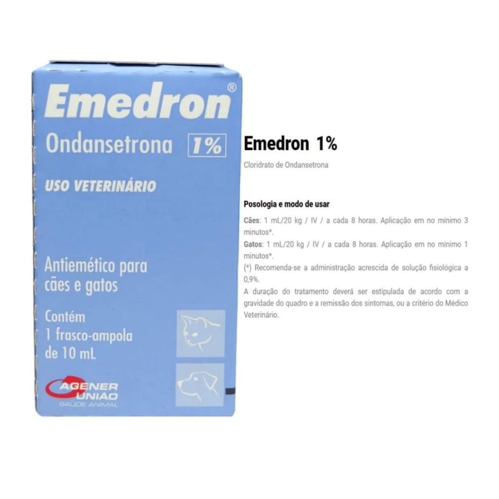 DESCRIÇÃO: Kit 02 Emedron Líquido Cães Gatos 1% 10mg 10ml Ondansetrona Vômito O Emedron 10 mg solução é um antiemético para cães e gatos, fabricado pelo laboratório Agener União. Sua formulação é indicada para prevenir e tratar náuseas e vômitos, sendo especialmente útil em situações como quimioterapia, pós-operatório e gastroenterites. Composição: O princípio ativo é o cloridrato de ondansetrona a 1%. A ondansetrona age bloqueando a serotonina, um neurotransmissor que desencadeia o vômito. Apresentação: A solução de 10 mg é vendida em frasco-ampola com 10 ml. Indicações: A ondansetrona é um antiemético potente, e o Emedron 10 mg solução é recomendado para o controle de náuseas e vômitos causados por: Quimioterapia. Radioterapia. Pós-operatório. Gastrites e gastroenterites. Administração: A aplicação é feita por via intravenosa, intramuscular ou subcutânea, conforme a orientação do médico-veterinário. ------------------------------------------------------------------------------------------------------------------ A MANADA ANIMAL é um marketplace de produtos veterinários. É a escolha certa para tutores que prezam pela qualidade dos produtos que seu animal necessita. Tudo com o suporte de uma equipe de veterinários e gestores com mais de 10 anos de experiência no mercado. Fique tranquilo, todos os nossos produtos são originais, adquiridos através de distribuidores credenciados! Ah, e todas as vendas acompanham nota fiscal! MANADA ANIMAL, Tranquilidade pra você, cuidado para ele!