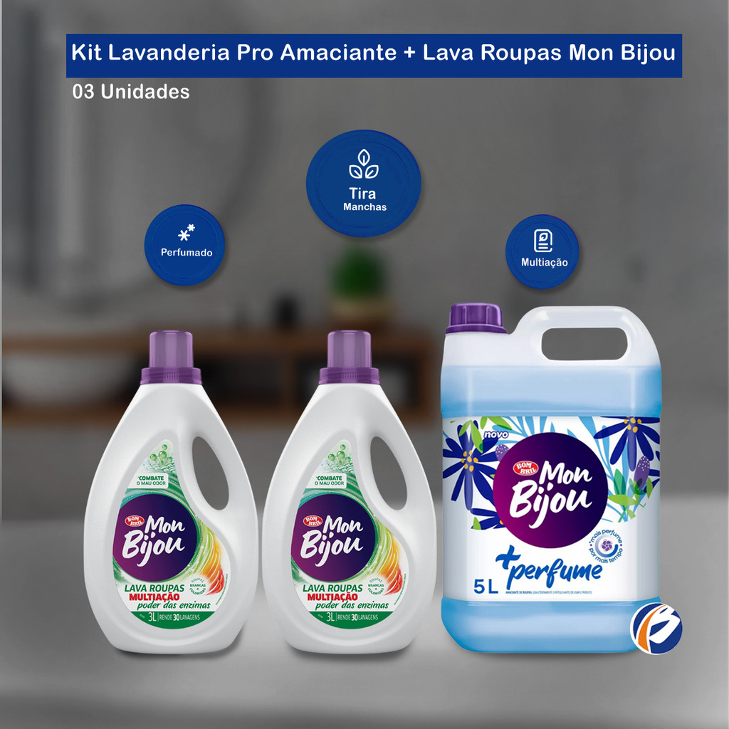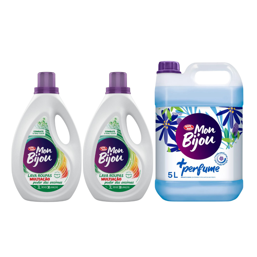 Kit Lavandeira: 02un Lava Roupa Multiação Fresh 3L Mon Bijou + 01un Amaciante Mais Perfume Azul 5L Mon Bijou Lava Roupa Multiação com Poder Fresh 3L Mon Bijou é a solução certa para manter as suas roupas sempre limpas e livres de manchas difíceis, graças à sua fórmula de limpeza poderosa. Tudo isso, sem danificar o tecido e mantendo aquele aspecto de novo. Este lava roupas remove até as manchas mais difíceis, devolvendo o branco das roupas, protegendo as fibras e cores do tecido, agindo como um produto 2 em 1, já que tira manchas e lava o tecido Indicação de Uso: Lavagem de roupas brancas e coloridas. Embalagem: 02 galões de 3L cada Amaciante Mais Perfume Azul 5L Mon Bijou, desenvolvido com cápsulas ativas de perfume que deixam as suas roupas perfumadas por mais tempo até depois de secas facilitando na hora de passar. Perfeito para quem costuma lavar uma grande quantidade de roupas, os amaciantes Mon Bijou 5L tornam o seu dia a dia muito mais prático e econômico. 3 em 1 perfuma, amacia e seca mais rápido. + Perfume, com mais perfume por muito mais tempo. + Frescor, bloqueia os maus odores. + Proteção, cores vivas por muito mais tempo protegendo as fibras dos tecidos. + Cuidado, hipoalergênico dermatologicamente testado, sem corantes e seguro para peles sensíveis. + Maciez, para que suas roupas fiquem fáceis de passar e mais gostosas de usar Cor: Azul Embalagem: 01 Galão de 5L