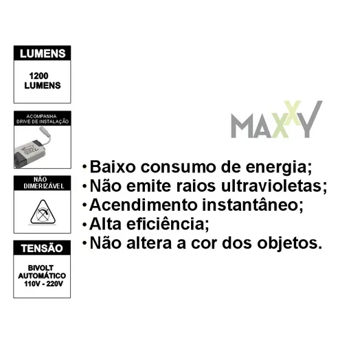 M.A DISTRIBUIDOR AUTORIZADO EMPRESA DE TRADIÇÃO ENVIO IMEDIATO GARANTIA DE 01 ANO Painel Sobrepor - Laje, Telhados, Áreas em Geral CARACTERÍSTICAS DE FUNCIONAMENTO › Temperatura ambiente: -5°C a 40°C. › Tensão nominal: 100V a 240V. › Fator de potência: >0,50. › Baixo consumo de energia. INFORMAÇÕES TÉCNICAS: › Potência: 18w › Fluxo luminoso: 1260 lm › Eficiência luminosa: 70 lm/W › Temperatura da cor: 6500K › Índice de proteção: IP20 › Tensão: BIVOLT › Ângulo de abertura: 120º › IRC** >70 › Indicada para uso interno › NÃO DIMERIZÁVEL › Embutir
