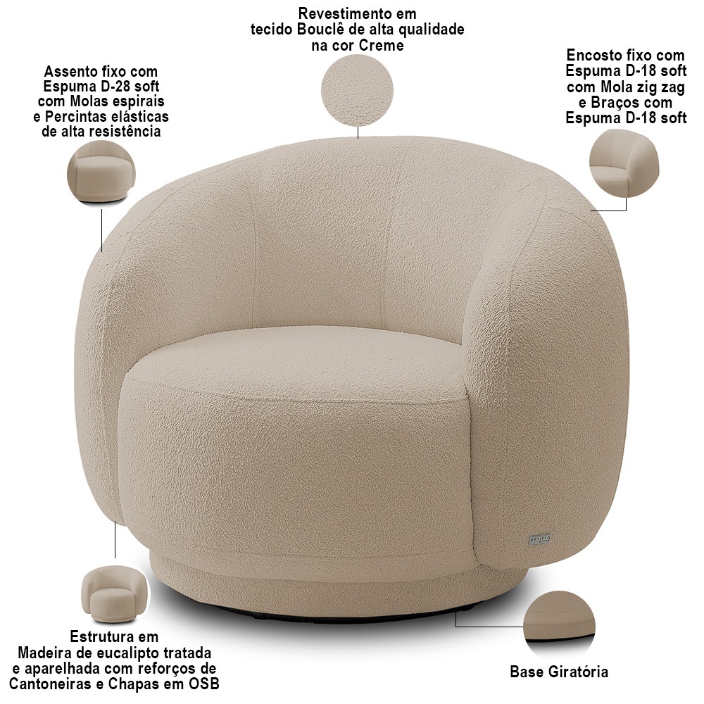 O Kit com 02 Poltronas Giratória Orgânica Para Sala Living Elodie M05 Bouclê Creme, da Lyam Decor, é sinônimo de conforto e sofisticação na medida certa. Ela se destaca em qualquer ambiente, seja na sala de estar, no living, no escritório ou na recepção. Seu design orgânico e linhas minimalistas combinam facilmente com diversos estilos de decoração. Além disso, a tapeçaria com espuma de alta densidade proporciona um conforto incomparável, enquanto a estrutura em madeira garante resistência e durabilidade e a base giratória garante mais versatilidade. Com a poltrona orgânica Elodie, você terá uma peça decorativa impecável e um espaço cheio de beleza e elegância. Prepare-se para se surpreender! Dimensões da Poltrona (L x A x P) 95 x 78 x 89 cm Características: Estrutura em madeira de lei (eucalipto), tratada e aparelhada com reforços de cantoneiras e chapas em compensado. Revestimento em tecido Bouclê de alta qualidade na cor Creme. Assento fixo com espuma D-28 soft, molas espirais e percintas elásticas de alta resistência. Encosto fixo com espuma D-18 soft, mola zig zag. Braços com espuma D-18 soft. Base giratória. Design orgânico para uso em diversos ambientes. Peso suportado: Até 120 kg. - Por se tratar de estofado as medidas podem ter uma pequena variação de até 3 cm. - A tonalidade do produto real poderá ter ligeira variação devido o lote de tecidos. - Indicado para uso residencial, sua limpeza deve ser feita com pano levemente umedecido em água limpa, sem esfregar, não utilizar produtos abrasivos, desengordurantes, álcool ou solvente. Observações importantes: - Produto para uso residencial em ambiente interno, não devendo ficar exposto diretamente ao sol, calor e umidade excessivos. - Pode haver alguma diferença de tonalidade entre a imagem e o produto real, por conta do tratamento de imagens e a calibração de cores do seu monitor. - As imagens são meramente ilustrativas, não acompanham objetos de decoração e eletrônicos. - Ao receber a mercadoria, o cliente deve verificar as condições da embalagem, caso haja alguma avaria não assine o comprovante de recebimento e entre em contato com nossa loja para orientações. - Montagem, desmontagem e outras instalações serão de responsabilidade do cliente. Não nos responsabilizamos, no ato da entrega, por subir escadas/elevadores ou pelo transporte por guincho em apartamentos. Eventuais despesas são de responsabilidade do comprador. - Confira as dimensões do produto e certifique-se de que passará normalmente por supostos elevadores, portas, escadas e/ou corredores de sua residência. - Para mais informações, acesse nossa Central de Atendimento.