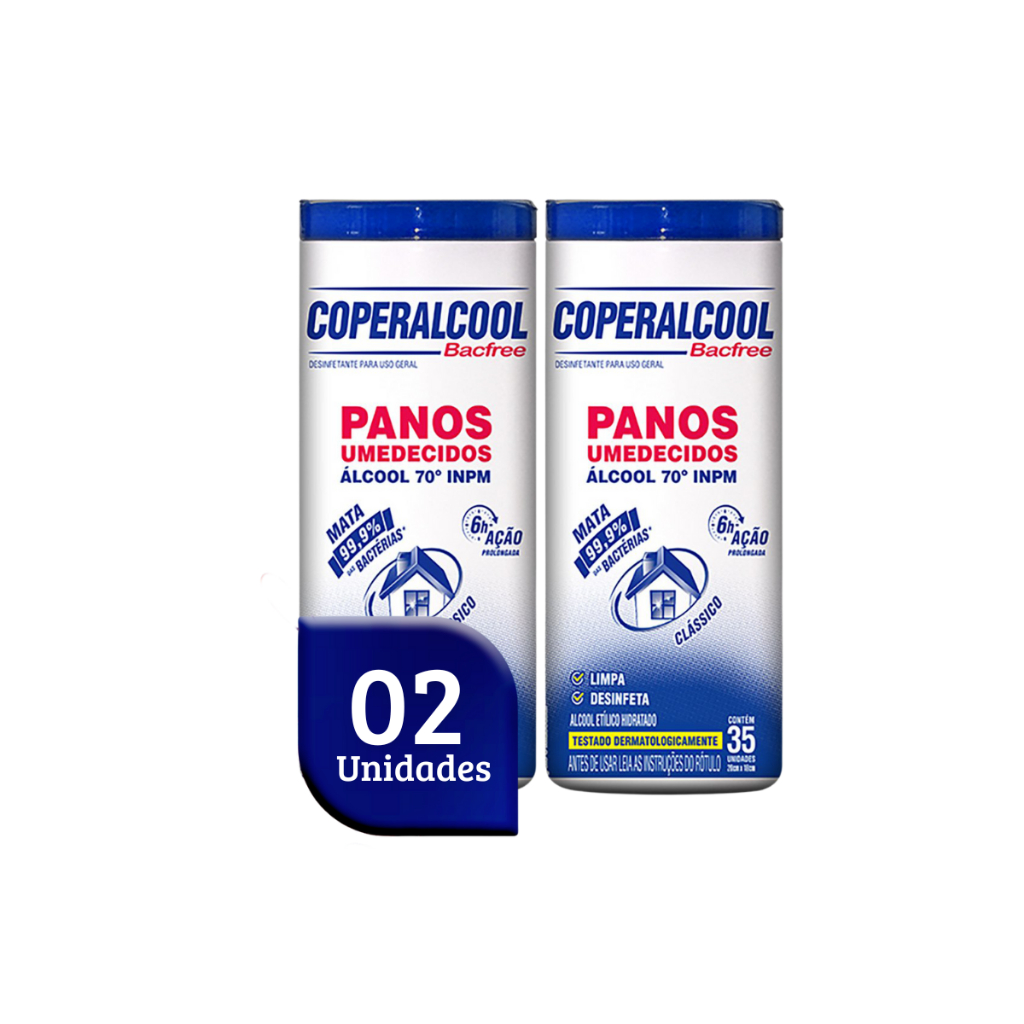 Kit 02 Potes de Lenços Umedecidos Álcool 70 com 35 lenços cada Coperalcool Os panos já são umedecidos em álcool 70º INPM garantindo uma limpeza eficaz e 6h de ação prolongada contra bactérias. É um super aliado para a limpeza dos ambientes comerciais, proporcionando praticidade e segurança na desinfecção de superfícies e objetos. Indicação de Uso: - Ideal para a limpeza de multissuperfícies utilização em estabelecimentos comerciais como restaurantes, academias e clínicas de estética; - Não utilizar em superfícies sensíveis ao álcool como em superfícies enceradas, laqueadas, pintadas e envernizadas; E na desinfecção de alimentos. Modo de Uso: - Deixe agir por no mínimo 10 minutos; - Não derramar sobre o fogo. Manter afastado do fogo e do calor. Não perfurar a tampa. Conserve fora do alcance das crianças e dos animais domésticos. Fragrância: Clássico Embalagem: 02 potes com 35 lenços cada