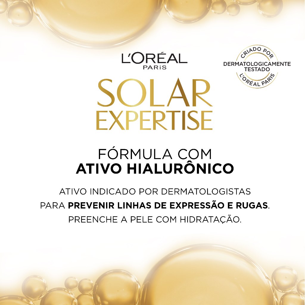 L’ORÉAL PARIS SOLAR EXPERTISE ANTIRRUGAS FPS 60 é um protetor solar facial de uso diário desenvolvido para todos os tipos de pele. Possui filtros solares de altíssima eficácia que entregam alta proteção contra os raios UVA/UVB, prevenindo o envelhecimento cutâneo provocado pela exposição ao sol (rugas e manchas solares). Proteja sua pele dos raios solares com o Kit 02 Protetor Solar Facial L’Oréal Paris Solar Expertise Antirrugas. Dupla ação antienvelhecimento: sua fórmula é enriquecida com Ativo Hialurônico que hidrata a pele, reduzindo e prevenindo o surgimento de rugas graças a sua ação preenchedora. Além de alta proteção UVA/UVB contra os efeitos do sol, possui textura leve e fácil de espalhar. Sua fórmula de alta tecnologia é de fácil aplicação, possui rápida absorção oil-free e resistência à água. Seu rosto até 60 vezes mais protegido do que se você não tivesse aplicado o produto. Tecnologia O Protetor Solar L'Oréal Expertise Antirrugas possui tecnologia exclusiva Mexoryl SX + XL, uma ciência avançada que protege a pele contra os raios UVA e UVB e contra os danos solares mais profundos, além de contar com ativo hialurônico que hidrata profundamente a pele, previne o aparecimento de rugas, linhas finas de expressão e manchas causadas pela exposição ao sol. Benefícios - Alta proteção contra raios UVA e UVB - Rosto até 60 vezes mais protegido - Previne rugas e hidrata a pele, devido ao Ativo Hialurônico - Previne o envelhecimento solar - Previne rugas e manchas solares - Rápida absorção - Oil-free Modo de Uso Aplique abundantemente sobre a pele 30 minutos antes da exposição ao sol. Se a quantidade aplicada não for adequada, o nível de proteção será significativamente reduzido. É necessária a reaplicação do produto para manter sua efetividade. Reaplicar sempre, após sudorese intensa, nadar ou banhar-se, secar-se com toalha e durante a exposição ao sol. - Precauções: Evite o contorno dos olhos. Em caso de contato direto com os olhos, lavar em abundância com água corrente. - Advertência: não aplicar em crianças. Sobre a Marca L’Oréal Paris, a marca N1 em beleza no mundo, desenvolve produtos de alta performance, ao melhor custo-benefício. Ao longo da sua trajetória, combinou pesquisa e inovação com o objetivo de democratizar a beleza. Sempre apresentando novidades nas categorias Capilar, Coloração, Cuidados com a Pele e Proteção Solar. L’Oréal Paris tem a beleza, excelência e elegância como suas principais paixões. Presente em mais de 120 países a marca oferece para as consumidoras sua expertise e a qualidade de seus produtos. Porque você vale muito!