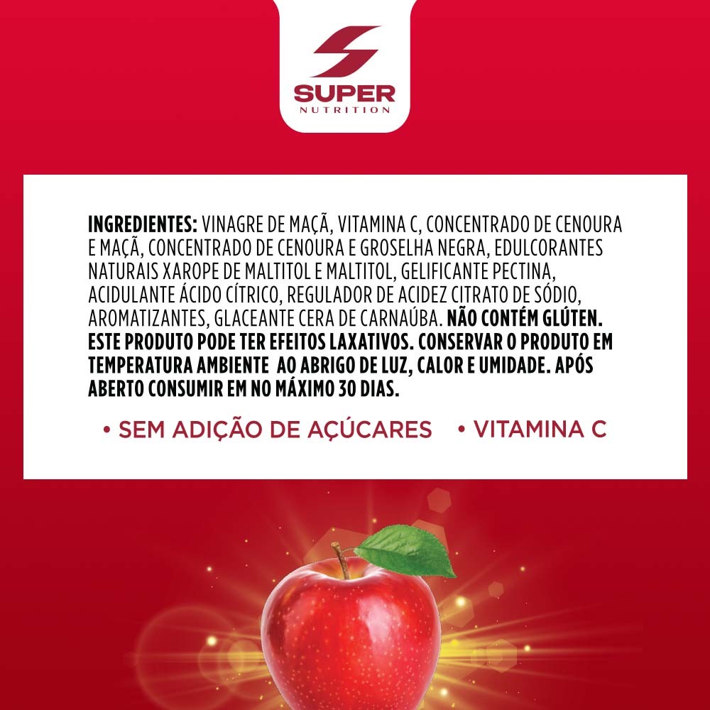 Você vai amar esta novidade: Super Gummy Apple HD, o novo suplemento em gomas da Super Nutrition. O que é Super Gummy Apple HD ? São gomas feitas a base de Vinagre de Maçã Vitamina C, que proporcionam inúmeros benefícios com delicioso sabor de Maçã. Benefícios da Vitamina C ✓ A vitamina C auxilia na absorção de ferro dos alimentos. ✓ A vitamina C é um antioxidante que auxilia na proteção dos danos causados pelos radicais livres. ✓ A vitamina C auxilia no funcionamento do sistema imune. ✓ A vitamina C auxilia na formação do colágeno. ✓ A vitamina C auxilia na regeneração da forma reduzida da vitamina E. ✓ A vitamina C auxilia no metabolismo energético. ✓ A vitamina C auxilia no metabolismo de proteínas e gorduras. PERGUNTAS FREQUENTES Quando devo consumir o produto?Consumir duas (2) balas ao longo do dia. De preferência, manter o consumo sempre no mesmo horário. Posso comer mais de uma goma ao dia?Recomendamos que seja ingerido duas gomas ao dia para atingir a dose recomendada conforme informação nutricional. O produto quebra jejum?Sim, embora o produto seja baixo em valor energético há um aporte nutricional que interfere no jejum. Qual ingrediente está encobrindo as gomas?O pó que está na cobertura das gomas é o maltitol. O que é maltitol?É um poliol extraído a partir do milho, chamado de edulcorante ou adoçante e tem a função de substituir o açúcar refinado (sacarose), evitando que seja adicionado açúcar ao produto e controlando a quantidade de calorias presentes. O produto é vegano?Não podemos afirmar, pois não temos o selo de comprovação; porém todos os ingredientes da fórmula não são de origem animal.