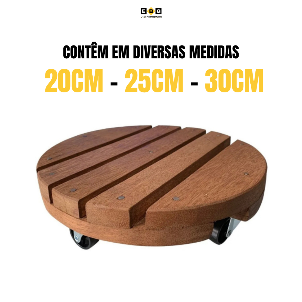 CONTEÚDO 02 unidades – Suporte para vaso redondo 20cm - 25cm - 30cm; CARACTERÍSTICAS - Marca: EBG Comercial; - Dimensões Disponíveis: 20cm, 25cm e 30cm de diâmetro; - Madeira pinus envernizada artesanalmente; - Suporta até 80kg; - Contém 4 rodinhas giratórias, proporcionando mobilidade suave e sem riscos ao piso; - Formato redondo, acabamento rústico e elegante, combinando com diversos estilos de decoração; - Fabricado com madeira ecológica, contribuindo para a preservação ambiental; - Ideal para uso em ambientes internos e externos, como salas, varandas, jardins e áreas de serviço; - Resistente à umidade e variações de temperatura, garantindo longa vida útil; INDICAÇÕES DE USO - Vasos de plantas; - Botijões de gás; - Baldes e caixas organizadoras; - Outros objetos que necessitem de suporte móvel e resistente;