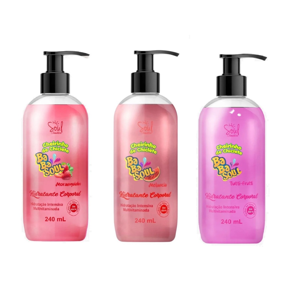 O Hidratante Corporal BabaSoul Soul Cosméticos 240ml é uma forma divertida e gostosa de hidratar a pele. Delicioso e concentrado hidratante corporal com cheirinho de chiclete, enriquecido de Vitamina E, Vitamina C e Provitamina B5, que proporcionam uma pele ultra macia e deliciosamente perfumada. Hidratação profunda e efetiva para o seu dia a dia. Modo de Usar: Com a pele limpa e seca, aplique uma quantidade generosa do produto e espalhe até completa absorção. O produto pode ser aplicado por todo o corpo e rosto, podendo ser usado várias vezes ao dia. Val: 08/26.