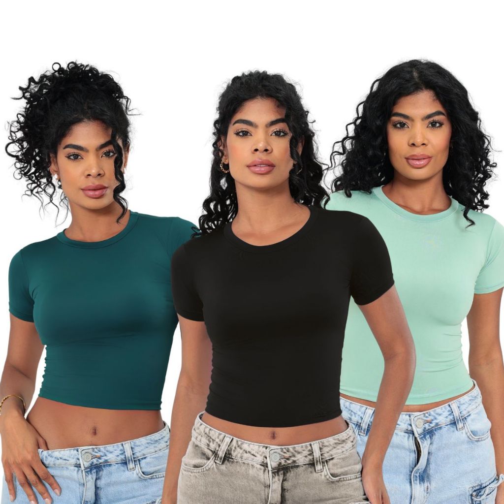 KIT 03 - Baby Tee Feminina - Blusa Slim Fit Manga Curta: Blusa de Compressão