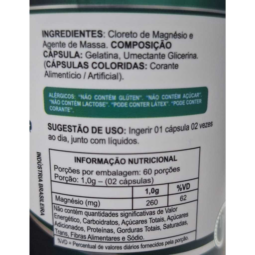 Esse Produto não é Medicamento O consumo do Cloreto de Magnésio PA, pode trazer grandes benefícios para a saúde Sugestão de uso: Tomar 02 cápsulas ao dia. Advertências Consulte um médico antes de usar se você estiver grávida, amamentando, usando algum medicamento ou se tiver algum problema de saúde. Interrompa o uso e consulte um médico se ocorrer qualquer reação adversa. Mantenha fora do alcance de crianças. Armazene em temperatura ambiente. Não usar se o lacre estiver rompido ou ausente. Produto isento de registro conforme RDC 24/2018.