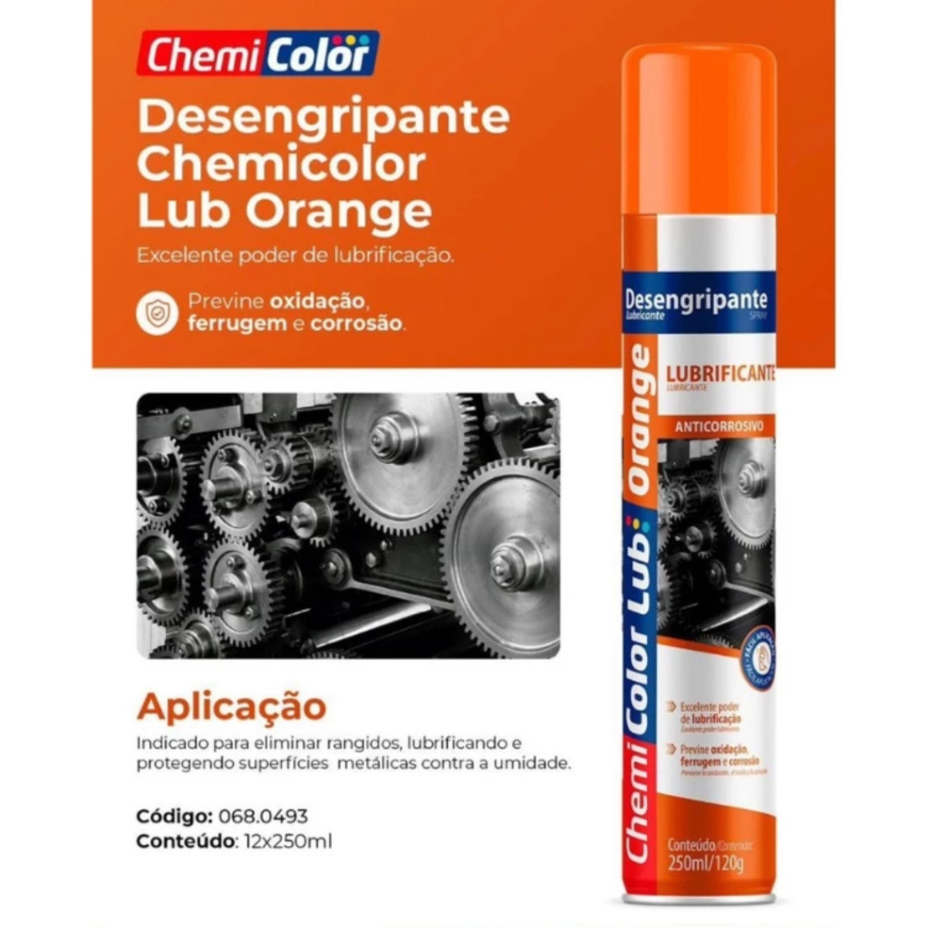 Descrição Do Produto O desengripante ChemiLub é uma mistura de óleos com aditivos especiais que proporcionam alta performance de penetração. Desenvolvido para facilitar na hora de desemperrar porcas, parafusos e também peças que estejam oxidadas, enferrujadas e sujas. Contém um excelente poder lubrificante, protetivo e anti umidade. Pode ser aplicado em múltiplas formas: indústrias, carros, motos, bicicletas, em casa, equipamentos esportivos e mecanismos em geral. Lubrifica enquanto protege contra a ferrugem e umidade. INSTRUÇÕES DE USO Agite bem a embalagem antes de cada aplicação. Aplique o produto direcionando o p jato na superfície desejada. Em locais de difícil acesso utilize o prolongador para uma aplicação locação localizada. LOCAIS DE USO: Carro (partes cromadas e de metal), residência (eletrodoméstico, dobradiças, fechaduras, trincos e peças de ferro). Lazer e esporte (material de caça e pesca, lancha, moto, bicicleta). Industria e oficina (ferramentas e peças em geral). PRECAUÇÕES ATENÇÃO. Aerossol inflamável. Recipiente pressurizado: pode romper se aquecido. Provoca irritação à pele. Provoca irritação ocular. Pode provocar sonolência ou vertigem. Tóxico para os organismos aquáticos, com efeitos prolongados. Mantenha afastado do calor, faísca, chama aberta ou superfícies quentes. Não fume. Não pulverize sobre chama aberta ou outra fonte de ignição. Mantenha ao abrigo da luz solar. Não exponha a temperaturas superiores a 50°C. EM CASO DE CONTATO COM A PELE: Lave com água e sabão em abundância. EM CASO DE CONTATO COM OS OLHOS: Enxágue cuidadosamente com água durante vários minutos. No caso de uso de lentes de contato, remova-as, se for fácil. Continue enxaguando. EM CASO DE INALAÇÃO: Remova a pessoa para local ventilado e a mantenha em repouso numa posição que não dificulte a respiração. APRESENTAÇÃO Aerossol – 250ml/120g