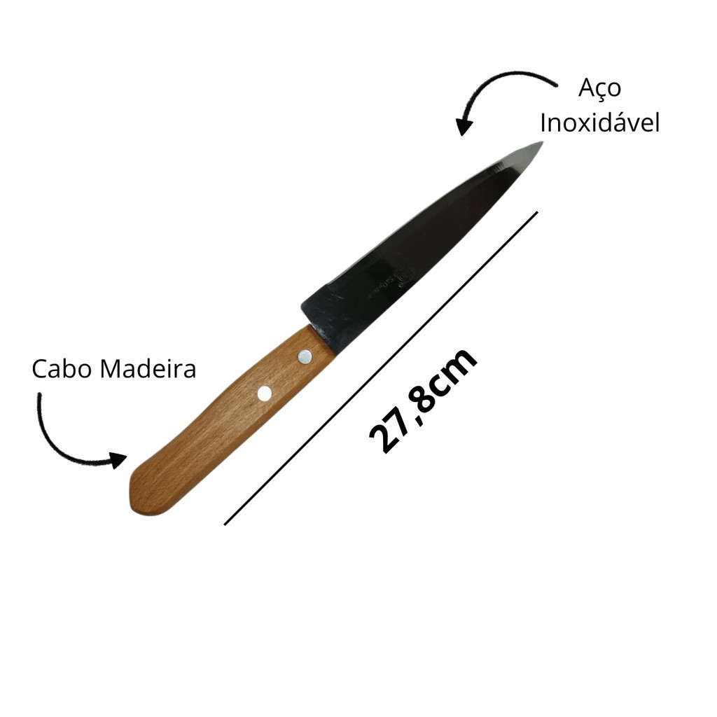 KIT 03 Facas de Cozinha Aço Inox Cabo Madeira 6", 7" e 8" O KIT 03 Facas de Cozinha é essencial para qualquer cozinheiro, oferecendo precisão e durabilidade. Com lâminas de aço inoxidável e cabos de madeira, estas facas proporcionam um corte eficiente e seguro em diversos alimentos. °Características Principais: - Lâminas de Aço Inoxidável: Garantem resistência à corrosão, durabilidade e corte afiado. - Cabos de Madeira: Proporcionam uma pegada confortável e segura, além de um design elegante. - Tamanhos Variados: Inclui facas de 6", 7" e 8", ideais para diferentes tipos de cortes e preparações na cozinha. - Versatilidade: Adequadas para cortar carnes, legumes, frutas e outros alimentos, oferecendo praticidade no preparo das suas receitas. °Informações Técnicas: - Material da Lâmina: Aço inoxidável de alta qualidade. - Material do Cabo: Madeira tratada, resistente e ergonômica. °Dimensões: - Faca de 6": 27,6 cm de comprimento total. - Faca de 7": 30,3 cm de comprimento total. - Faca de 8": 32,8 cm de comprimento total. Peso: Leve e balanceado para facilitar o manuseio. Na nossa loja, oferecemos produtos que combinam qualidade e funcionalidade para a sua cozinha. O KIT 03 Facas de Cozinha Aço Inox Cabo Madeira é uma excelente escolha para quem busca eficiência e elegância ao preparar suas refeições. Entre em contato conosco para adquirir este produto ou conhecer mais opções em nosso catálogo. Estamos sempre à disposição para atendê-lo e oferecer as melhores soluções para suas necessidades culinárias.