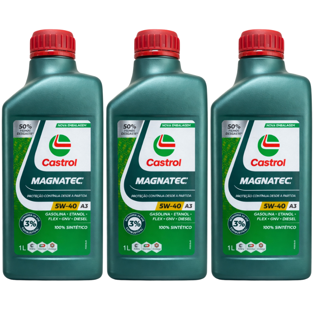 CASTROL MAGNATEC 5W40. Este anuncio contem: 03 - Óleo Castrol Magnatec 5w40 Sintético 1 litro. O Castrol MAGNATEC foi projetado para oferecer proteção instantânea a partir do momento em que você dá a partida no carro, reduzindo drasticamente o desgaste do motor. ESPECIFICAÇÕES DE DESEMPENHO DO PRODUTO: SAE: 5W-40; API: SN; ACEA: A3/B4; VW 502 00/505 00; MB-Approval 229.5; Renault RN 0700/ RN 0710. O SEU MOTOR NECESSITA DE UM ÓLEO CRIADO ESPECIALMENTE PARA PROTEGÊ-LO CONTRA O DESGASTE CAUSADO POR TRÂNSITO LENTO. Cada vez que você vai ao trabalho ou leva os filhos para a escola de carro, é inevitável parar em sinais vermelhos ou cruzamentos. Dirigir em marcha lenta no trânsito provoca um desgaste prejudicial em seu carro. O Castrol® MAGNATEC® protege o seu motor em condições de tráfego intenso, oferecendo uma proteção 20% melhor contra os danos produzidos pelo desgaste no motor, durante os avanços e paradas no trânsito lento. O QUE ESTÁ ACONTECENDO? Os motores são feitos para funcionar de forma eficaz em altas velocidades, com pequenas variações. Porém, a velocidade do automóvel varia muito nas condições de trânsito lento, em que o carro “avança e para”, já que é preciso acelerar, desacelerar, andar em marcha lenta, frear e, depois, repetir toda essa manobra. Estudos mostram que esses movimentos chegam, em média, a 18.000 repetições ao ano e que estas variações de velocidade causam um desgaste microscópico nas partes críticas do motor. Isso acontece porque as cargas nas partes críticas do motor em marcha lenta podem ser até 66% maiores do que em velocidades mais altas e constantes, típicas de estradas. Por isso o desgaste no motor é muito maior no trânsito lento, quando se “avança e para”. A nossa empresa comercializa apenas produtor originais de fabricantes certificado pelo ISO 9001. Dúvidas frequentes: Nós trabalhamos apenas com produtos novos e com garantia. Nossos produtos são de qualidade original, respeitando todas as regras do fabricante. Produto a pronta entrega. Seus produtos serão enviados em até 24 horas úteis. Sobre o produto: Além de ser responsável pela lubrificação, o óleo atua na prevenção do desgaste, da oxidação e da corrosão das peças do motor. Assim, o componente garante o bom desempenho do propulsor e evita prejuízos para o motorista. A lubrificação errada, no entanto, pode significar a redução da performance do automóvel, o aumento no consumo de combustível e até mesmo a fundição do motor. Uma lubrificação ineficiente pode ser causada por vários fatores, desde o modo de aplicação no motor até a utilização de lubrificantes que não seguem as especificações das montadoras do veículo Sobre nossa empresa: Estamos há mais de 30 anos no mercado de autopeças, buscando sempre a satisfação dos nossos clientes. Trabalhamos com as melhores marcas do ramo automotivo e aqui você encontrará as melhores peças para seu veículo, e contará com qualidade e o melhor atendimento. Nossos produtos são todos rigorosamente conferidos e embalados para que chegue até você da melhor maneira. Trabalhamos somente com peças novas, originais ou de marcas de primeira linha.