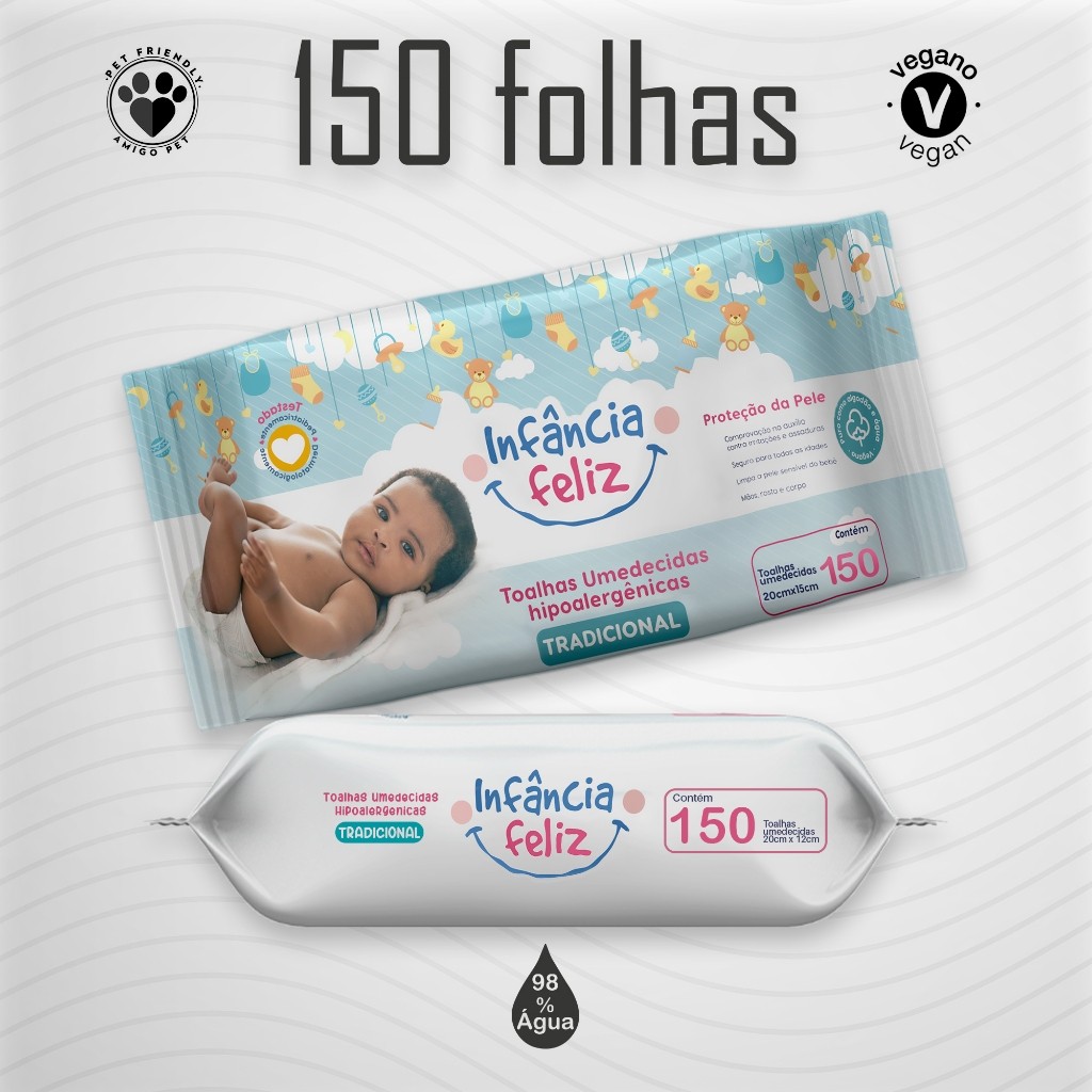 Kit 03 Pacotes Toalhas Umedecidas INFÂNCIA FELIZ - 150 Folhas - Vegano - 98% Água