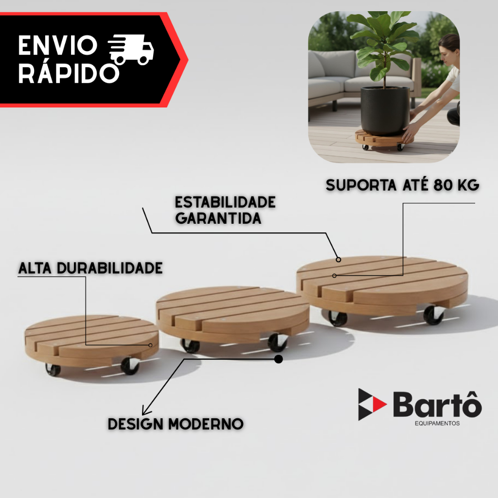 Kit 03 Suportes Arredondados para Vaso – 20cm / 25cm / 30cm – Suporta até 80kg O Kit 03 Suportes Arredondados com Rodinhas é perfeito para quem busca praticidade na hora de movimentar vasos de plantas, baldes, galões e outros objetos pesados. Com design resistente e estável, cada suporte suporta até 80 kg, garantindo segurança e mobilidade no dia a dia. Disponíveis nos tamanhos 20 cm, 25 cm e 30 cm, se adaptam a diferentes tipos de vasos e recipientes, evitando arranhões no piso e facilitando a limpeza e reorganização do ambiente. Destaques do Kit Kit com 3 suportes arredondados Suporta até 80 kg cada Rodinhas resistentes e de fácil movimentação Disponível nos tamanhos: 20cm, 25cm e 30cm Evita arranhões no piso Ideal para vasos, baldes, galões e utilidades Material resistente e durável Indicado para ✔️ Vasos de plantas ✔️ Baldes e galões ✔️ Botijão leve ✔️ Ambientes internos e externo