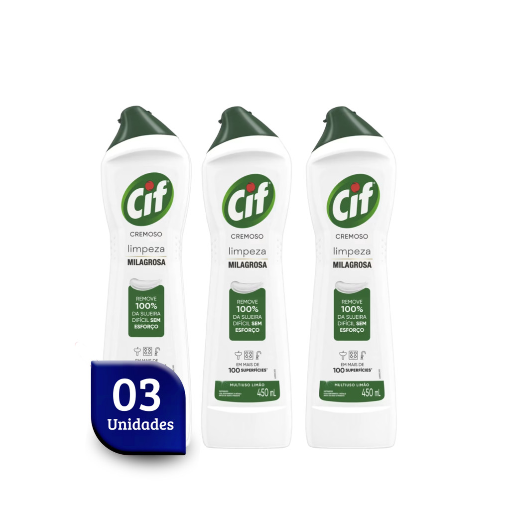 Kit 03un Saponáceo Líquido Cremoso 450ml Cif Cif Cremoso é um poderoso saponáceo que remove 100% da sujeira difícil, sem esforço! Possui uma fórmula exclusiva, com micropartículas de origem natural, que rende 7 garrafas de um limpador comum e limpa sem riscar, removendo toda a sujeira, desde a mais pesada até a manutenção do dia a dia, deixando um brilho imbatível. A família de saponáceo multiuso CIF Cremoso possui outras variedades de fragrâncias como Laranja e Limão, todas super refrescantes e se adaptam ao seu estilo e à sua casa. Indicação de Uso: - Pode ser usado em metais, inox, alumínio, cerâmicas, porcelana, couro sintético, borracha e plástico. Fragrância: Laranja / 03 Frascos de 450ml cada Fragrância: Limão / 03 Frascos de 450ml cada Fragrância: Original / 03 Frascos de 450ml cada Fragrância: Misto / 01 Frasco de 450ml de cada fragrância (01 Laranja / 01 Limão / 01 Original)