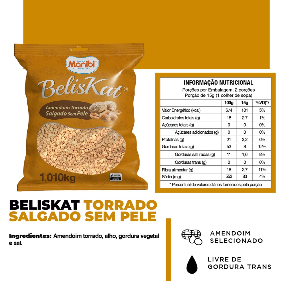 | Kit 03x Amendoim Torrado Salgado Sem Pele C/ Sal Beliskat - 1Kg este produto | R$ 77,15 | 15% | 5.0/5 | — |