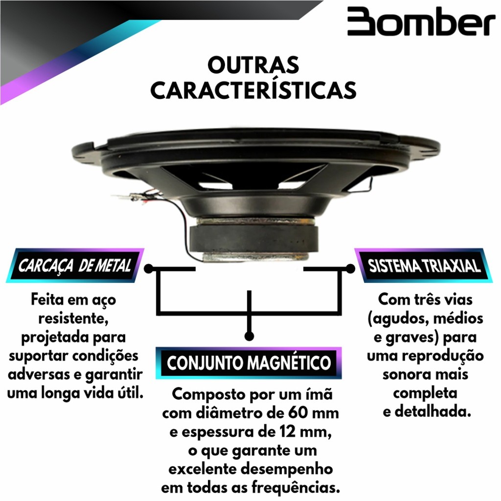 Kit 4 Alto Falantes Triaxiais 6 Bomber BBR Top - 240 Watts Rms o Kit de alto-falante BBR TOP 6 é a escolha ideal para melhorar a qualidade sonora do seu veículo. Com um cone em IMPP, oferece uma resposta de frequência de 55 Hz a 20 kHz, garantindo reprodução precisa e cristalina. Seu conjunto magnético de 60 mm e 12 mm de espessura proporciona desempenho superior nos médios, agudos e graves. Com potência máxima de 60 W RMS cada, oferece um som potente e impactante. Sua carcaça em aço resistente assegura durabilidade e longa vida útil, além de ser fácil de instalar em diversos modelos de veículos. Especificações Técnicas: • Marca: Bomber • Modelo: 6BBRT-60 • Tamanho: 6 Polegadas • Potência (RMS): 60 WRMS (cada) • Impedância nominal: 4 Ohms • Resposta em frequência (–10 dB) : 55 Hz - 20 kHz • Sensibilidade (Banda efetiva): 89 dB SPL • Diâmetro da bobina: 19,6 mm • Altura do enrolamento / Camadas: 6 mm / 2 • Material do corpo da bobina: Kapton • Material do fio da bobina: Cobre • Altura do gap: 3,7 mm • Xmax (deslocamento máx. pico); 1,15 mm • Xlimite (antes do dano): 4,85 mm • Dimensional do imã: 60 x 12 mm • Material do cone: IMPP • Material suspensão: Borracha • Material da centragem: Algodão e poliester • Material da carcaça: Aço Parâmetros Thiele-Small: • Fs (frequência de ressonância): 79 Hz • Vas (volume equivalente do falante): 11,85 • Qts (fator de qualidade): 1,70 • Qes (fator de qualidade elétrico): 2,76 • Qms (fator de qualidade mecânico): 4,41 • No (eficiência de referência): 0,20 • Sd (área efetiva do cone): 136cm² • BL (densidade de fluxo bobina): 2,39 T.m • Sensibilidade: 85,21 dB SPL • Re (resistência elétrica): 3,6 Ohms • Zmin (impedância mínima): 3,82 Ohms • Mms (massa móvel): 8,88 g • Cms (compliância mecânica): 0,46 mm/N • Le @ 1 kHz (indutância da bobina): 0,22 mH • Le @ 10 kHz (indutância da bobina): 0,08 mH Conteúdo da Embalagem: • 04 Alto Falantes 6 Bomber Triaxial BBR Top - 240 Watts RMS • Certificado de Garantia Importante: • Garantia de 273 Dias. • Valor do Kit.