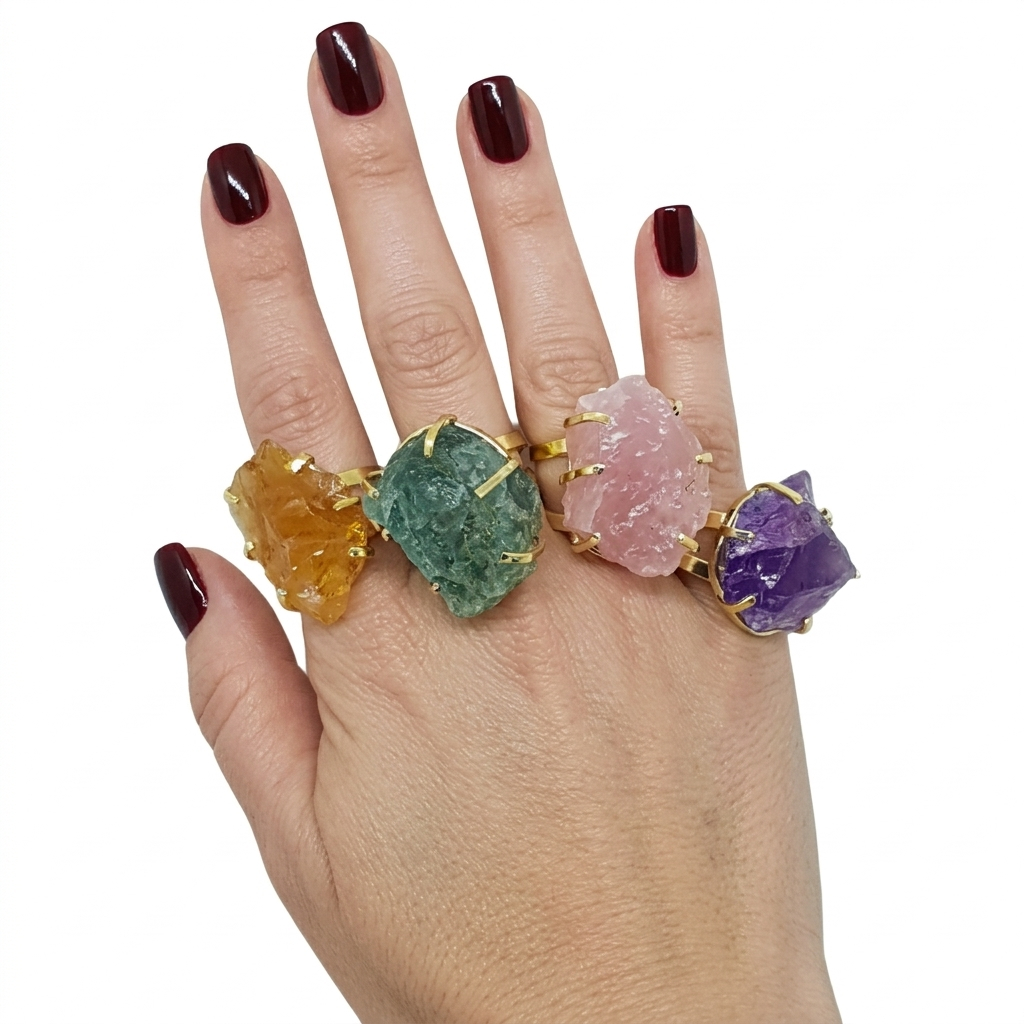 KIT 04 ANÉIS DE PEDRAS BRUTAS NATURAIS BANHADOS A OURO 18K REGULÁVEIS