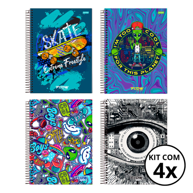 Kit 04 Cadernos Universitário 10 Matérias 160 Folhas Flow - Jandaia CAPA:Skate/Alien/Boys/Olho