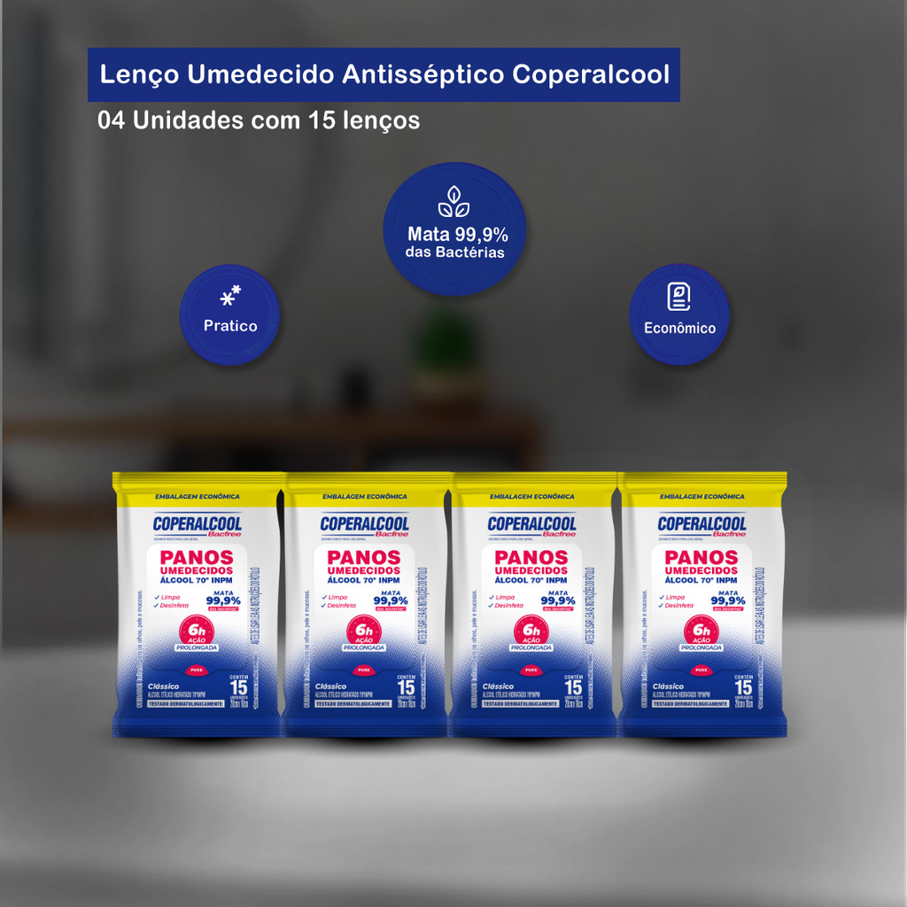 Kit 04 Pacotes de Lenços Umedecidos Álcool 70 Clássico com 15 Lenços cada Coperalcool Os panos já são umedecidos em álcool 70º INPM garantindo uma limpeza eficaz e 6h de ação prolongada contra bactérias. É um super aliado para a limpeza dos ambientes comerciais, proporcionando praticidade e segurança na desinfecção de superfícies e objetos. Indicação de Uso: - Ideal para a limpeza de multissuperfícies utilização em estabelecimentos comerciais como restaurantes, academias e clínicas de estética; - Não utilizar em superfícies sensíveis ao álcool como em superfícies enceradas, laqueadas, pintadas e envernizadas; E na desinfecção de alimentos. Modo de Uso: - Deixe agir por no mínimo 10 minutos; - Não derramar sobre o fogo. Manter afastado do fogo e do calor. Não perfurar a tampa. Conserve fora do alcance das crianças e dos animais domésticos. Fragrância: Clássico Embalagem: 04 pacotes com 15 panos cada