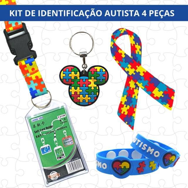 Kit 04 Peças Identificação Autismo Azul Cordão Com Porta Crachá Pulseira Chaveiro Adesivo Laço Autista - CÓD. 015