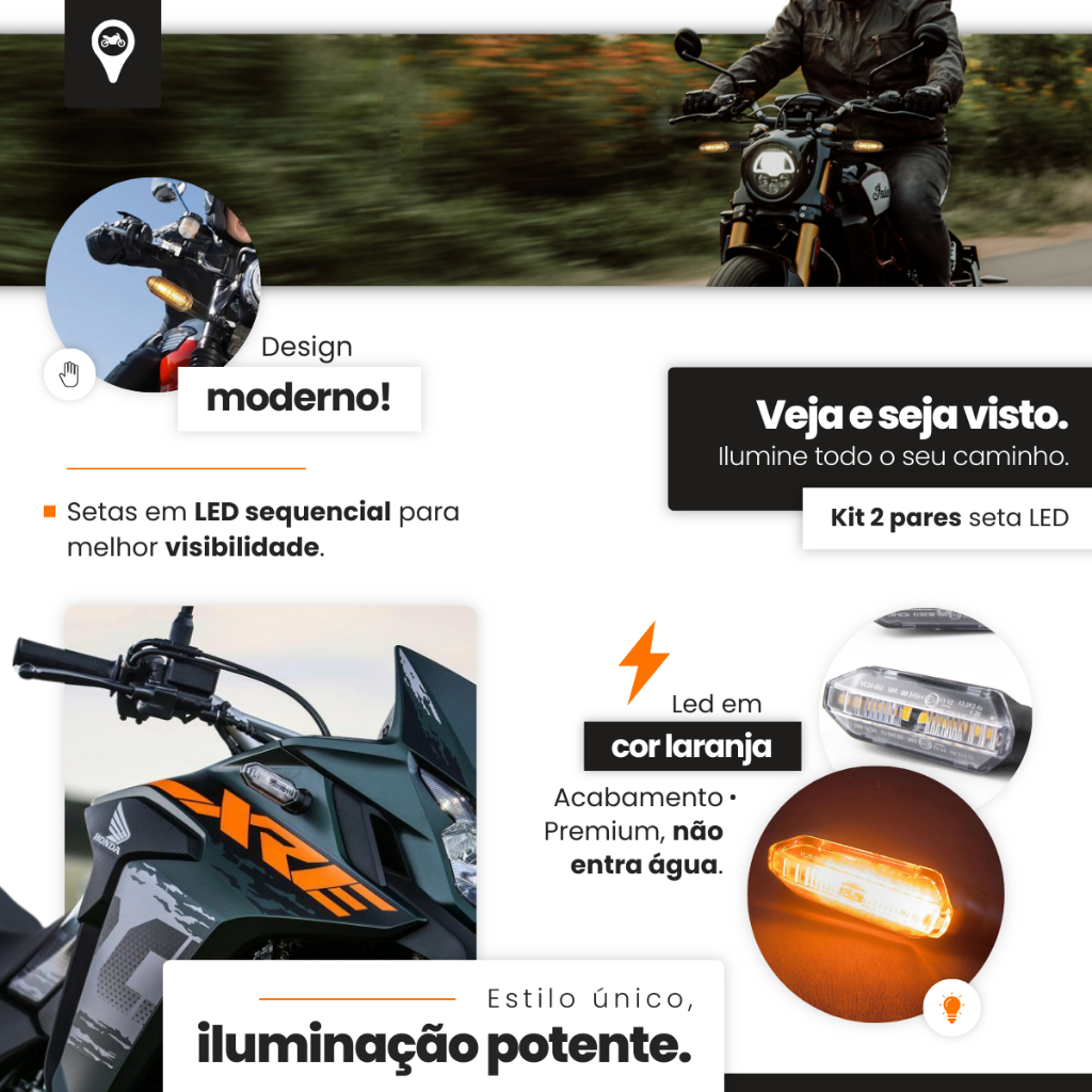 Kit Pisca LED Sequencial para Moto (4 Unidades – 2 Pares) + Relê de Pisca Seta LED 2 Pinos com Regulagem de Velocidade – Universal (Rosca 10mm) Transforme a sinalização da sua moto com este kit completo de piscas LED sequenciais, que acompanha 4 unidades (2 pares) + 1 relê eletrônico de 2 pinos com regulagem de velocidade. Ideal para quem busca estilo, segurança e modernização do sistema de iluminação da moto. ✅ Características dos Piscas Sequenciais: Modelo Universal – Compatível com a maioria das motos que utilizam rosca de 10mm (verifique a compatibilidade com sua moto antes da compra). Tecnologia LED Sequencial – LEDs de alto brilho na cor amarela, proporcionando excelente visibilidade mesmo durante o dia. Baixo consumo de energia – Economia sem perder desempenho. Design moderno – Lente lisa em acrílico cristal reforçado e carcaça em ABS de alta resistência, garantindo durabilidade e ótimo acabamento. Instalação fácil – Produto pronto para uso, com encaixe perfeito. Tensão de operação: 12V. ✅ Relê Eletrônico 12V para Pisca de LED – 2 Pinos com Regulagem de Velocidade: Compatível com diversos modelos: Titan, Fan, CG, YBR, Fazer, Factor, XTZ, Suzuki Yes e outras motos com sistema de 2 pinos. Evita piscadas aceleradas causadas pela substituição das lâmpadas incandescentes por LED. Regulagem de velocidade para ajuste conforme sua preferência. Tensão de funcionamento: 12V. Produto de alta qualidade e durabilidade. 📦 Conteúdo da Embalagem: 2 Pares de Pisca LED Sequencial (4 unidades) 1 Relê Pisca Seta LED 12V – 2 Pinos com regulagem de velocidade 💡 Dica: Verifique se sua moto utiliza rosca de 10mm antes da compra para garantir a compatibilidade. 🛵 Deixe sua moto com visual moderno e mais segurança nas sinalizações com este kit completo!