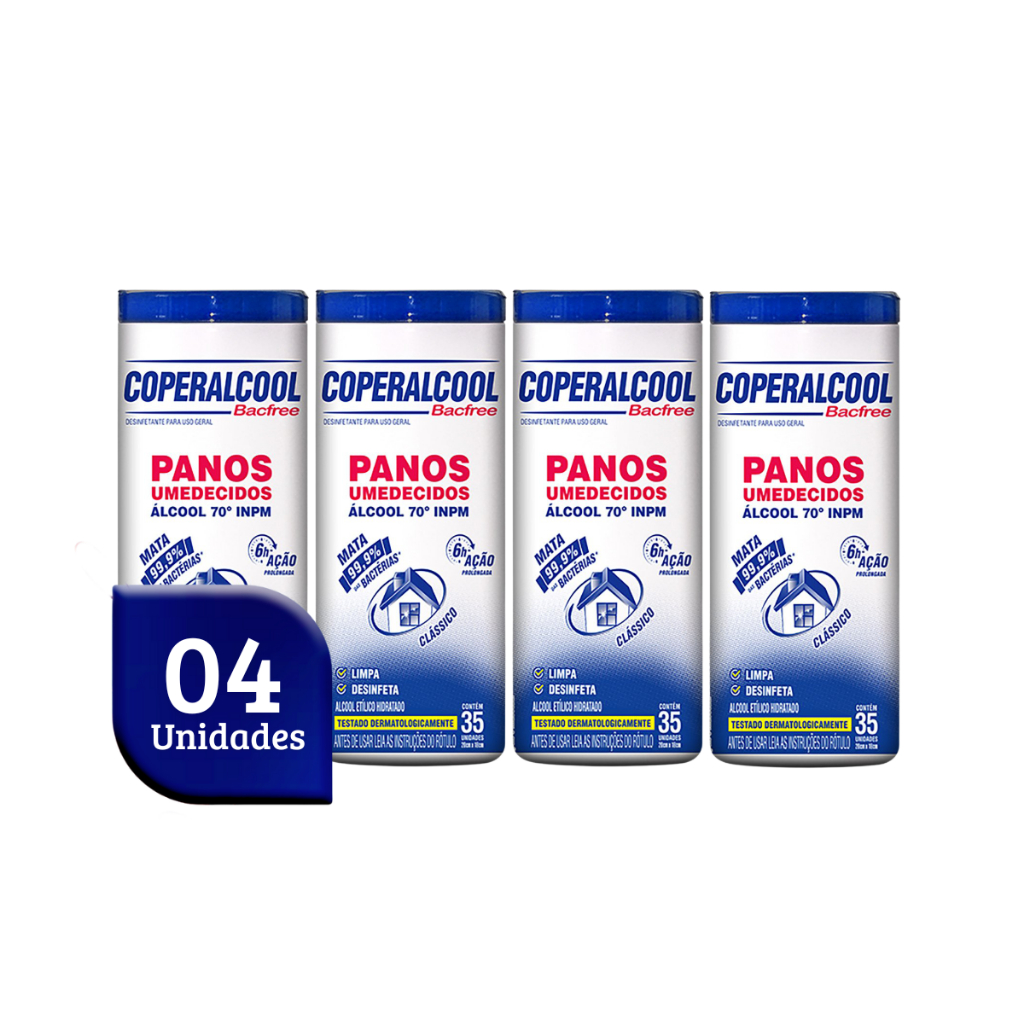 Kit 04 Potes de Lenços Umedecidos Álcool 70 com 35 lenços cada Coperalcool Os panos já são umedecidos em álcool 70º INPM garantindo uma limpeza eficaz e 6h de ação prolongada contra bactérias. É um super aliado para a limpeza dos ambientes comerciais, proporcionando praticidade e segurança na desinfecção de superfícies e objetos. Indicação de Uso: - Ideal para a limpeza de multissuperfícies utilização em estabelecimentos comerciais como restaurantes, academias e clínicas de estética; - Não utilizar em superfícies sensíveis ao álcool como em superfícies enceradas, laqueadas, pintadas e envernizadas; E na desinfecção de alimentos. Modo de Uso: - Deixe agir por no mínimo 10 minutos; - Não derramar sobre o fogo. Manter afastado do fogo e do calor. Não perfurar a tampa. Conserve fora do alcance das crianças e dos animais domésticos. Fragrância: Clássico Embalagem: 04 potes com 35 lenços cada