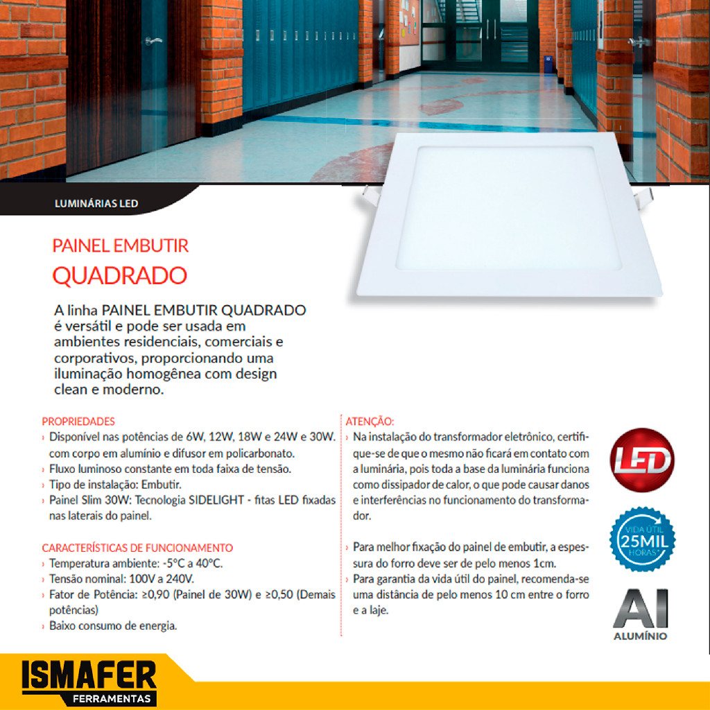 Distribuído por Ismafer Ferramentas Painel LED Quadrado Embutir 3000K 30W 400 x 400 x 30 (mm) Ilumine seu espaço com o moderno Painel Led Quadrado Embutir 30W. Com temperatura de cor de 3000K, este painel oferece uma luz de cor branco quente, ideal para ambientes que requerem uma iluminação brilhante e clara. Sua potência de 30W garante uma luminosidade eficiente, proporcionando uma atmosfera luminosa e agradável. Com tecnologia LED de última geração, é altamente econômico, consumindo menos energia em comparação às tradicionais lâmpadas incandescentes ou fluorescentes. Ideal para escritórios, cozinhas, banheiros, corredores e outros espaços internos. Esse painel oferece uma iluminação homogênea e de qualidade superior, contribuindo para um ambiente mais produtivo e aconchegante. FICHA TÉCNICA: - Tamanho do produto: 400 x 400 x 30 (mm) - Tamanho do corte (NICHO DE CORTE): 385 x 385 (mm) - Temperatura de cor: Branco quente (3000K) - Economia de energia em até 80% - Fluxo Luminoso : 2400 Lumens - Vida útil estimada em 25.000h - Eficiência Luminosa: 80 lm/W - Voltagem: 110-220V (Bivolt) - Tipo de instalação : Embutir - Ângulo de abertura: 120° - Fator de potência: >0,50 - Frequência: 50/60 Hz - Não Dimerizável - Proteção: IP20 - Potência: 30W - IRC : > 70 O que acompanha: - 5 Unidades Painel Plafon Luminária Led Quadrado Embutir 30w Avant Pra que é indicado: - Para iluminação geral dos seus ambientes internos. Substitui conjuntos de luminárias e lâmpadas fluorescentes compactas Medidas: - Largura: 400 mm - Comprimento: 400 mm - Altura: 30 mm Medidas de corte: - Largura: 385 mm - Comprimento: 385 mm Tempo de garantia: - 365 dias de fabrica Marca: Avant Modelo: 22629 EAN: 7899452020925 SKU: KIT22629-5 Distribuído por Ismafer Ferramentas