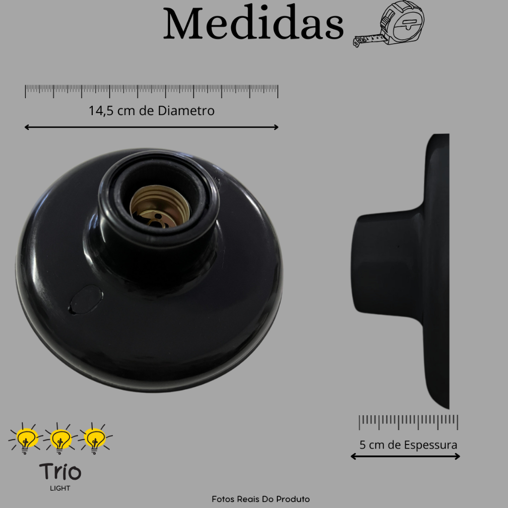 Somos Fabricantes. Plafon Simples Preto Anúncio Referente a 05 Unidades Informações Técnicas do Produto - Marca: Trio Light - Voltagem: Bivolt 110/220v - Potência: 40w (Led) - Corrente Máxima: 4A - Encaixe da Lâmpada: Soquete E27 (Tradicional) Em Termoplástico Cores Disponiveis: Preto - Material: Polímero de Engenharia (Plástico De Alta Qualidade, Resistente e Maleável) - Não acompanha Lâmpada!!! - Usar Somente Lâmpadas Led Dimensão do Produto: 14,5cm de Diâmetro Cuidados na Instalação: Este Plafon é conectado diretamente a rede elétrica. Desligue a rede elétrica durante todo o processo de instalação. Uso interno ou externo protegido em abrigo. O Plafon de plástico é uma opção versátil e funcional para iluminar ambientes internos e externos com eficiência e estilo. Seu design moderno e corpo fabricado em plástico resistente de alta qualidade o tornam leve e de fácil manuseio. Adaptável a diferentes estilos de decoração, proporciona iluminação eficiente e discreta, conferindo personalidade ao ambiente. Com baixo custo, alta durabilidade e alta resistência a impactos, o bocal em termoplástico torna-o uma escolha vantajosa para diversas aplicações. Em resumo, o Plafon de plástico combina modernidade, praticidade e eficácia, sendo uma opção econômica e de qualidade para a iluminação de ambientes internos e externos. Produto fabricado no Brasil.