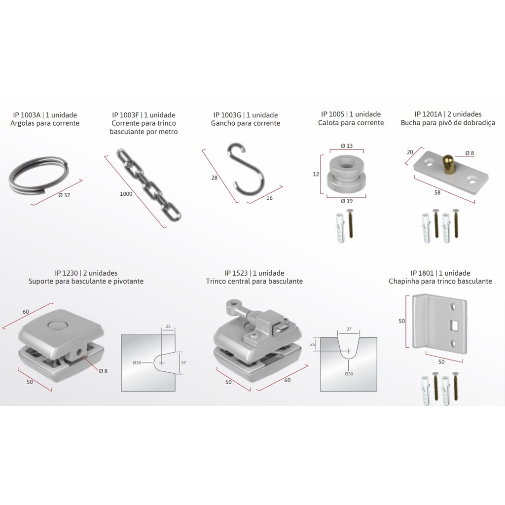 KIT 06Basculante Pequeno V/A IP 1003F |IP 1003G |IP 1201A |IP 1230 |IP 1523 |IP 1801 MATÉRIA-PRIMA Plástico de engenharia (nylon com fibra), aço, zamac e latão. CONSIDERAÇÕES Todas as membranas coladas. Lingueta fecho escorpião em metal. P 1003F (1 unidade) Corrente para trinco basculante por metro IP 1003G (1 unidade) Gancho para corrente IP 1201A (2 unidades) Bucha para pivô de dobradiça IP 1230 (2 unidades) Suporte para basculante e pivotante IP 1523 (1 unidade) Trinco central para basculante IP 1801 (1 unidade) Chapinha para trinco basculante *Imagens meramente ilustrativas *Todas as informações divulgadas são de responsabilidade do Fabricante/Fornecedor