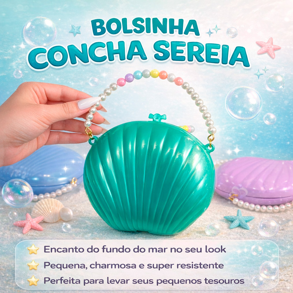 | Kit 06 Bolsinha Concha Sereia Ariel Plastica Alça de Perólas Lembra... este produto | R$ 199,90 | — | 5.0/5 | 7 |