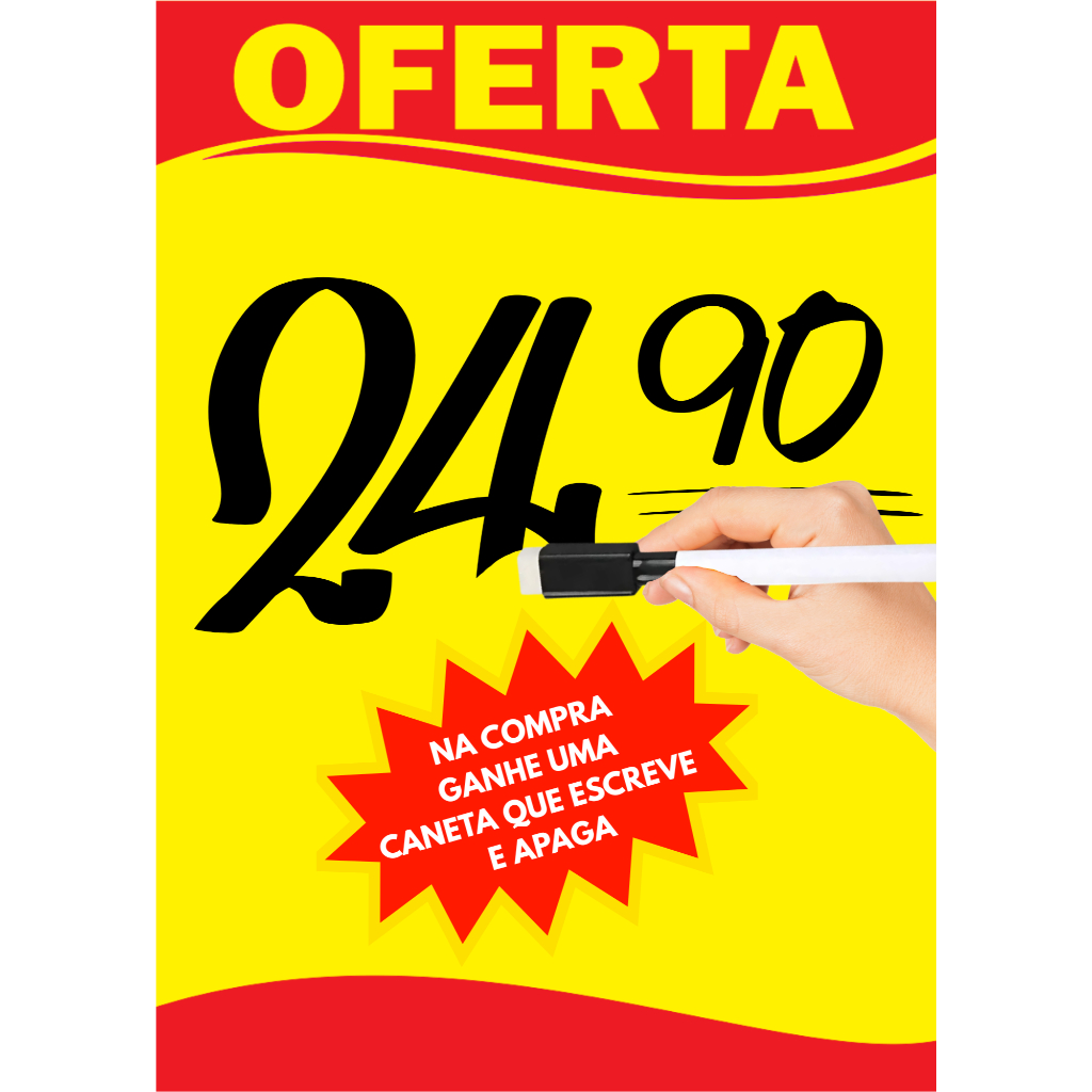 Transforme suas vendas com mais impacto, economia e praticidade! O Cartaz Reutilizável de Oferta A3 (30x42 cm) é perfeito para destacar promoções, atualizar preços em segundos e reduzir gastos com impressão de cartazes semanais. Produzido em papel 180 gramas com laminação frente e verso dando assim mais proteção, permite escrever e apagar facilmente, utilizando a caneta com apagador inclusa no kit. Ideal para supermercados, hortifrutis, feiras, açougues, mercearias e lojas de bairro, papel amarelo com detalhes impresso em vermelho garante alta visibilidade e chama a atenção de longe. Na compra enviaremos: - 6 cartazes reutilizáveis no tamanho 30x42 cm (A3) - 1 caneta apagável com ponta de feltro e apagador na tampa (brinde) - Produto leve, lâminado, durável e fácil de fixar com fita, ímã ou prendedores Vantagens exclusivas: - Reutilizável: escreva e apague e reutilize - Economia real: substitui cartazes impressos semanais - Agilidade: troque preços em segundos - Aparência: fundo chamativo que atrai clientes - Custo-benefício: kit completo pronto para uso imediato Compre agora seu kit de cartazes reutilizáveis A3 30x42cm e valorize suas ofertas com mais impacto visual !!!