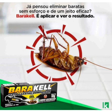 Principio Ativo: Imidacloprid 2% Indicação: Gel inseticida para o combate a baratas alemãs – baratinhas (Blatella germânica) e também elimina a barata de esgoto ou voadeira (Periplaneta americana). Utilize o BARAKELL em casa e apartamentos. Modo de usar: Aplicar vários pontos pequenos de gel – do tamanho da cabeça do fósforo – na proporção de 2 a 3 gotas por m2 ou a cada 50 cm uma das outras. Reaplicar o produto nos pontos onde foi consumido. Dosagem: 0,5 g/m2. Peso liq. 10g