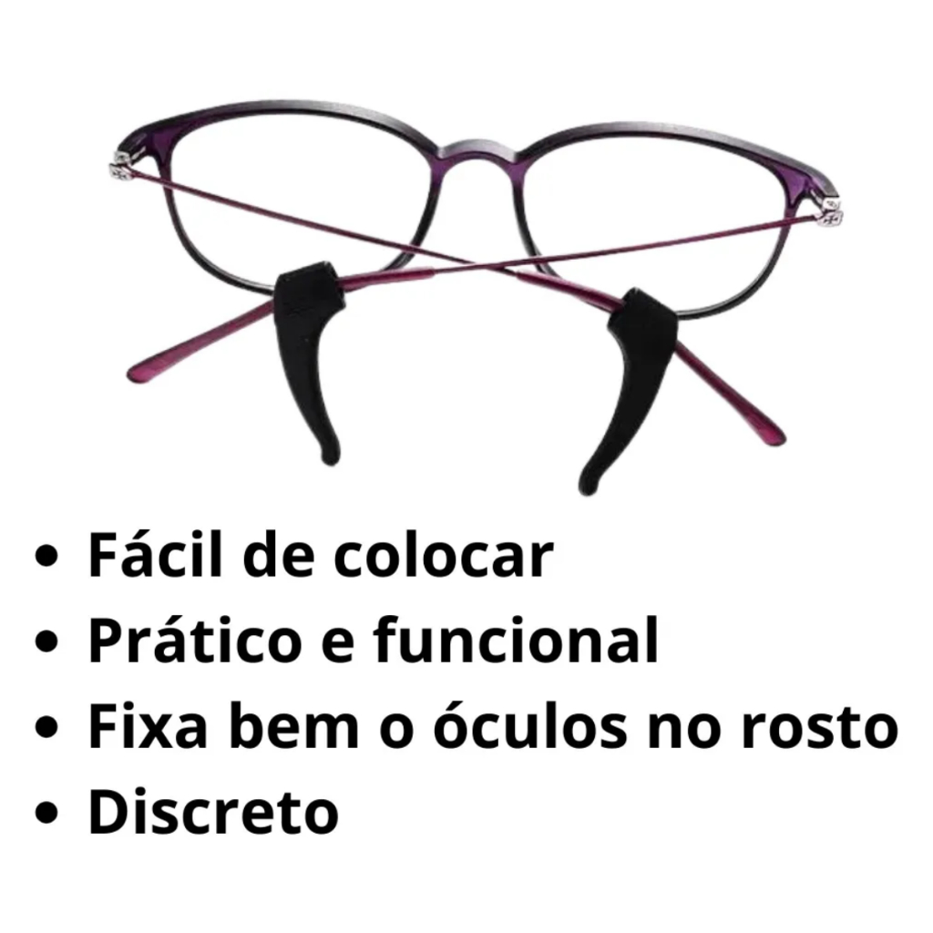 SEJAM BEM VINDOS A LOJA LDGS TECH! PRODUTO JA NO BRASIL , SEM TAXAS !!!!! Composição do Kit - ATENÇÃO AO ESCOLHER A OPÇÃO DESEJADA - 4 travas de oculos ( 2 pares) 6 Travas de óculos ( 3Pares ) Tenha mais segurança e conforto ao utilizar seus óculos com as travas de fixação ! - As travas evitam que o óculos escorregue do rosto, elas o mantém fixo no rosto - É discreto, leve e confortável. - Ajustável ao rosto - Adequado para praticamente todos os tipos de armação, do infantil ao adulto. Produto a pronta entrega, livre de taxação !