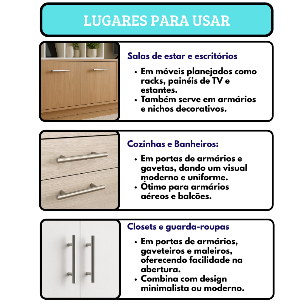 Adicione um toque de modernidade e sofisticação aos seus móveis com nosso Puxador Haste Redonda em Inox Escovado. Ideal para portas de armários, gavetas e estantes, seu design clean e acabamento escovado combinam perfeitamente com diversos estilos de decoração. 📐 Especificações Técnicas - Material: Aço Inoxidável de alta qualidade - Acabamento: Inox Escovado - Medidas: 6,4cm - 9,6cm - 12,8cm - 16cm - 19,2cm - 25,6cm - 28,8cm - 38,4cm - Incluso: Parafusos para fixação ✅ Benefícios - Durabilidade: Fabricado em aço inoxidável, resistente à corrosão e ao desgaste diário. - Design Versátil: Acabamento escovado que harmoniza com ambientes modernos e clássicos. - Fácil Instalação: Acompanha parafusos, facilitando a montagem em diversos tipos de móveis. - Conforto: Formato ergonômico que proporciona uma pegada confortável e segura. - Variedade de Tamanhos: Disponível em múltiplas medidas para atender diferentes necessidades. 🏡 Aplicações Sugeridas - Armários de cozinha - Gavetas de escritório - Portas de guarda-roupa - Móveis de banheiro - Estantes e racks - Móveis planejados em geral Este puxador é a escolha perfeita para quem busca qualidade, durabilidade e um design atemporal. Transforme seus móveis com um simples toque de elegância e funcionalidade.
