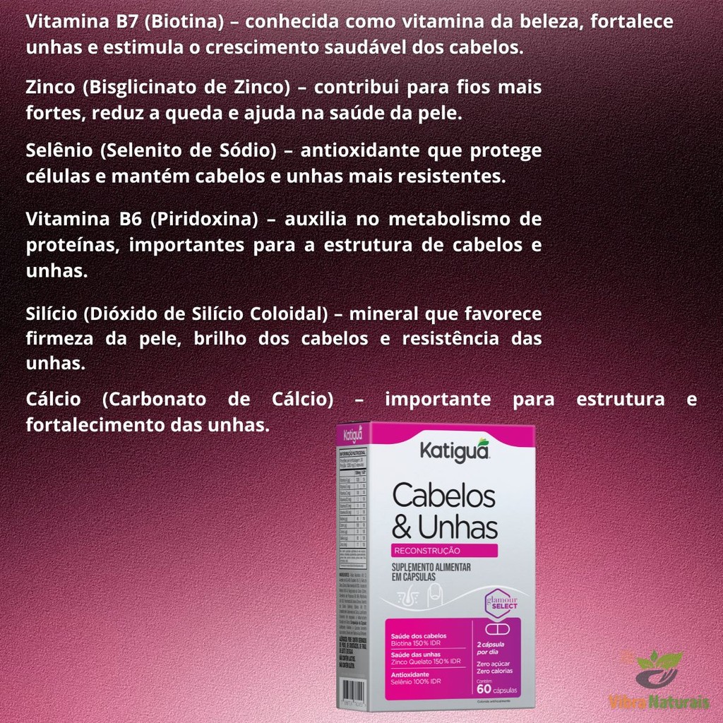 Olá, bem vindo a nossa loja! Somos revendedores oficiais da marca katiguá, trazendo os melhores produtos com os melhores preços da katiguá, se não encontrou o produto que procura nos mande uma mensagem. Produto Isento de registro na Anvisa Conforme RDC 240/18. Cabelos e Unhas Katiguá – 60 cápsulas Suplemento alimentar com vitaminas e minerais que complementam a rotina de quem busca mais cuidado com a beleza de dentro para fora. Fórmula com biotina, zinco e vitamina A Pode auxiliar na manutenção de cabelos, pele e unhas Ideal para rotinas de autocuidado e bem-estar Cápsulas práticas para o dia a dia Sem glúten Sua rotina de beleza começa com escolhas inteligentes!