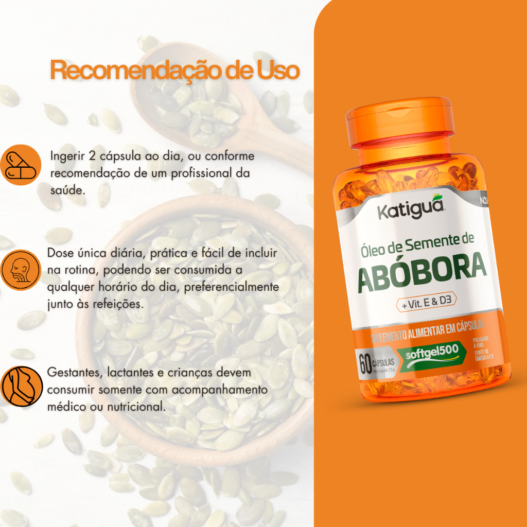 Olá, bem vindo a nossa loja! Somos revendedores oficiais da marca katiguá, trazendo os melhores produtos com os melhores preços da katiguá, se não encontrou o produto que procura nos mande uma mensagem. Produto Isento de registro na Anvisa conforme RDC 240/18. Óleo de Semente de Abóbora + Vitaminas D3 e E – Katiguá (60 cápsulas) Suplemento alimentar com fórmula que une óleo de semente de abóbora a vitaminas essenciais para o bem-estar diário. Fonte natural de ácidos graxos Com vitamina D3 e vitamina E Pode contribuir para o equilíbrio do organismo Apoio à rotina de cuidados diários Cápsulas práticas e fáceis de consumir Uma combinação inteligente para quem valoriza saúde e qualidade de vida no dia a dia.