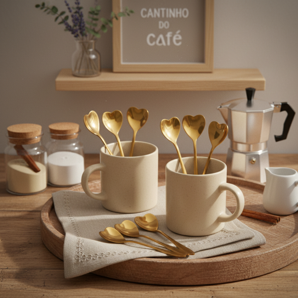 Kit 1/5/10 Colher Coração Talher Dourado Cozinha Luxo Cantinho do Café Sobremesa Aço Inox