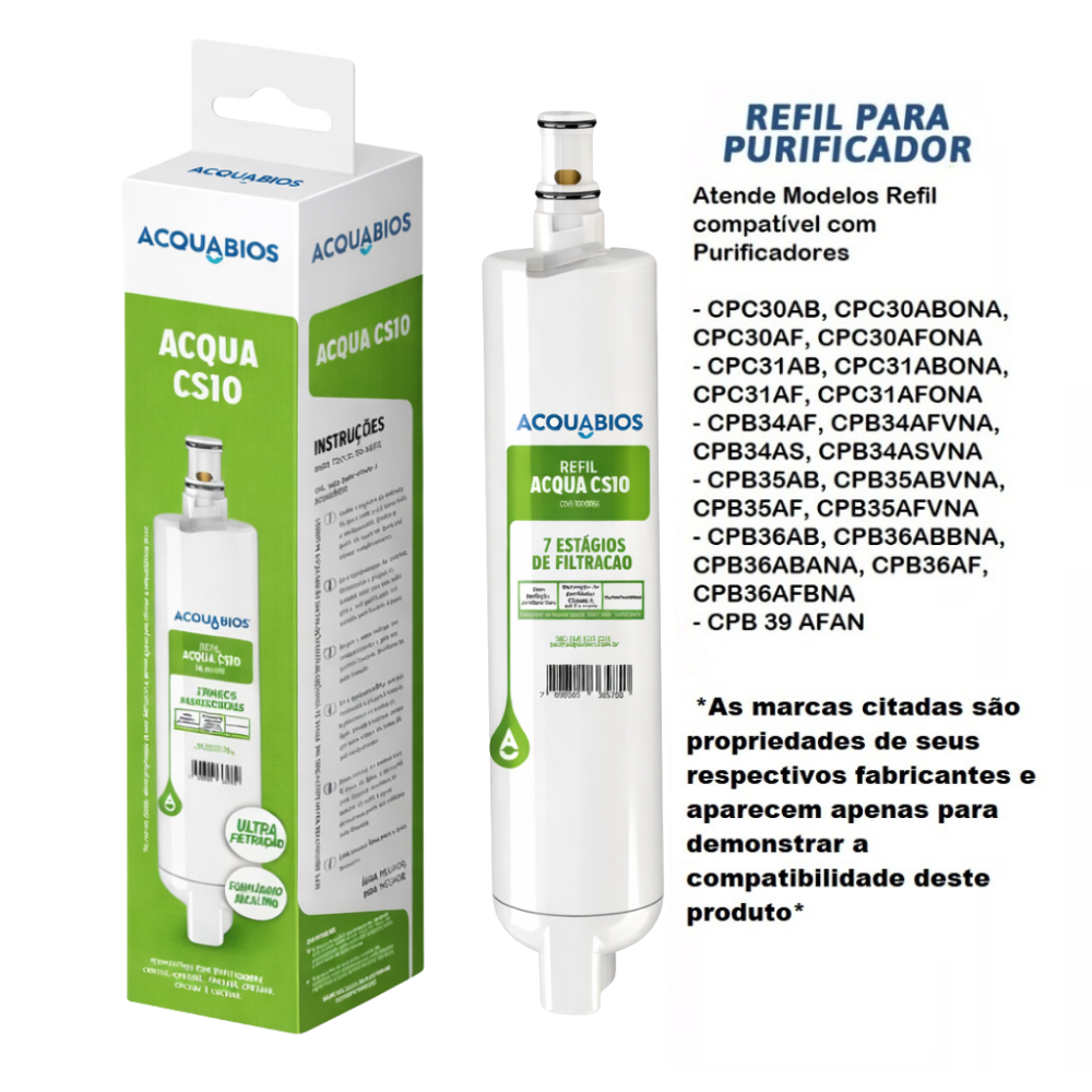 Refil Acqua CS10 – Classe A com 7 Etapas de Filtração e Ultra Eficiência Garanta água limpa, segura e saborosa para você e sua família! O Refil Acqua CS10 da Acquabios oferece tecnologia MULTIBAC com 7 etapas de filtração e eficiência bacteriológica com ultrafiltração, garantindo máxima retenção de partículas (Classe A), além de redução de cloro livre, odores e sabores desagradáveis presentes na água. Compatível com os purificadores Consul*: - CPC30AB, CPC30ABONA, CPC30AF, CPC30AFONA - CPC31AB, CPC31ABONA, CPC31AF, CPC31AFONA - CPB34AF, CPB34AFVNA, CPB34AS, CPB34ASVNA - CPB35AB, CPB35ABVNA, CPB35AF, CPB35AFVNA - CPB36AB, CPB36ABBNA, CPB36ABANA, CPB36AF, CPB36AFBNA As marcas citadas são de seus respectivos fabricantes e aparecem apenas para demonstrar a compatibilidade. 🔹 Benefícios principais Filtragem avançada em 7 etapas, para água mais pura Redução eficaz de cloro, odores e sabores Classe A em retenção de partículas (filtra partículas maiores que 0,5 µm) Tecnologia MULTIBAC – ação bacteriostática para água mais segura Fácil instalação e troca prática 📋 Especificações Técnicas Marca: Acquabios Vazão: 40 L/h Vida útil: 2.500 litros Pressão de trabalho: 19,6 kPa a 392 kPa Retenção de partículas: Classe A (>5 a <1 µm) Redução de cloro livre Ação bacteriostática ⚙️ Composição do Refil Polipropileno Carvão ativado 💧 Dica: Para manter a qualidade da água e o bom funcionamento do purificador, substitua o refil dentro do prazo recomendado pelo fabricante.