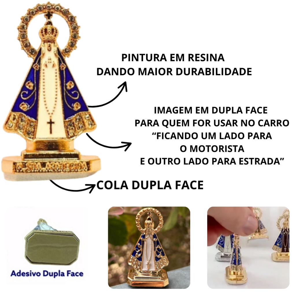 ENVIOS EM MENOS DE 24 HORAS !! SELECIONAR A VARIAÇÃO COM A QUANTIDADE DESEJADA Kit Imagens Nossa Senhora Aparecida para Carro – Fé e Proteção no Seu Caminho! Leve sua fé para onde for com este kit exclusivo com ate 3 mini imagens de Nossa Senhora Aparecida para colar no carro você pode escolher a quantidade desejada! Ideal para quem busca proteção divina no dia a dia e quer deixar o veículo com um toque de espiritualidade e carinho. Cada imagem é feita com detalhes delicados e acabamento de qualidade, disponível nas cores branca, marrom e prata, para você escolher a que mais combina com seu estilo — ou presentear quem você ama! Com fita dupla face já instalada, é só destacar e aplicar onde quiser: no painel do carro, espelho retrovisor, porta de entrada ou até mesmo no escritório. Simples, rápido e cheio de significado. Especificações: Material: PLASTICO Peso (cada unidade): Aprox. 25g Altura: 5,5 cm Cores: 1 branca, 1 marrom Fixação: Fita dupla face já aplicada (pronto para uso) Uso: Ideal para carro, escritório, casa, entre outros O que acompanha o pacote: 1 Imagem de Nossa Senhora Aparecida na cor branca OU 1 Imagem de Nossa Senhora Aparecida na cor marrom Todas com fita dupla face para fácil instalação