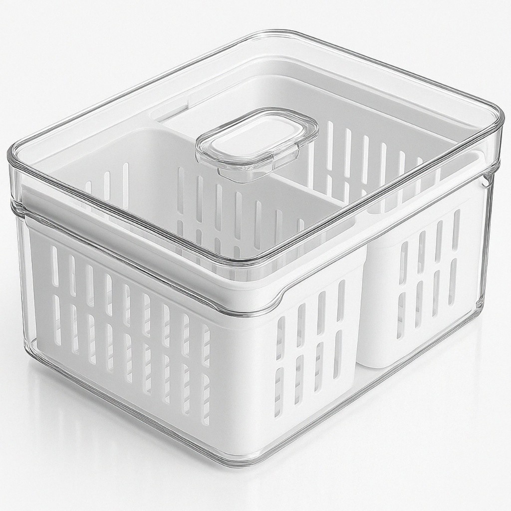 Organizador de Geladeira Clear Fresh 2,2L com 2 Cestos Removíveis – Transparente Mantenha sua geladeira sempre organizada e os alimentos frescos por mais tempo! Capacidade de 2,2 Litros 2 Cestos internos removíveis – ideal para separar frutas, legumes e verduras (verificar variação) Controle de umidade com ventilação ajustável – evita murchar e prolonga o frescor Bandeja com sistema de drenagem – alimentos secos por mais tempo Material resistente e livre de BPA Transparente – fácil visualização Empilhável – economiza espaço Dimensões Aproximadas Do Produto: Largura: 15cm Altura: 9,5cm Profundidade: 20cm Perfeito para quem busca praticidade, organização e mais durabilidade para os alimentos! Itens inclusos por Kit de variação: 1x Organizador Clear Fresh 2,2L 2x Cestos internos removíveis (de acordo com a variação)