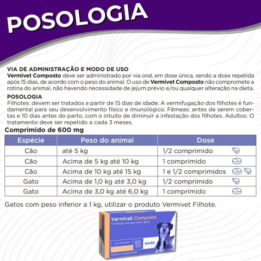 O Vermivet Composto Biovet é um vermífugo de amplo espectro desenvolvido para o tratamento e controle das principais verminoses intestinais que acometem cães e gatos. Sua fórmula balanceada reúne substâncias com ação complementar, atuando de forma eficaz contra vermes redondos e chatos em todas as fases do ciclo. Com alta eficácia e segurança, o Vermivet Composto é uma excelente opção para proteger o sistema digestivo do seu pet, prevenir infestações e manter a saúde e vitalidade do animal em dia. Benefícios do Vermivet Composto Biovet: Combate vermes redondos (nematódeos) e chatos (cestódeos) Indicado para cães e gatos de diferentes idades e portes Ação rápida e de amplo espectro Administração fácil e segura Produto com a qualidade Biovet, referência em saúde animal Cuide da saúde do seu pet com o poder e a confiança do Vermivet Composto Biovet!
